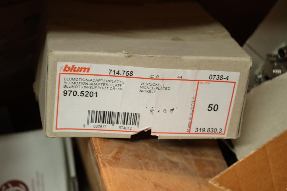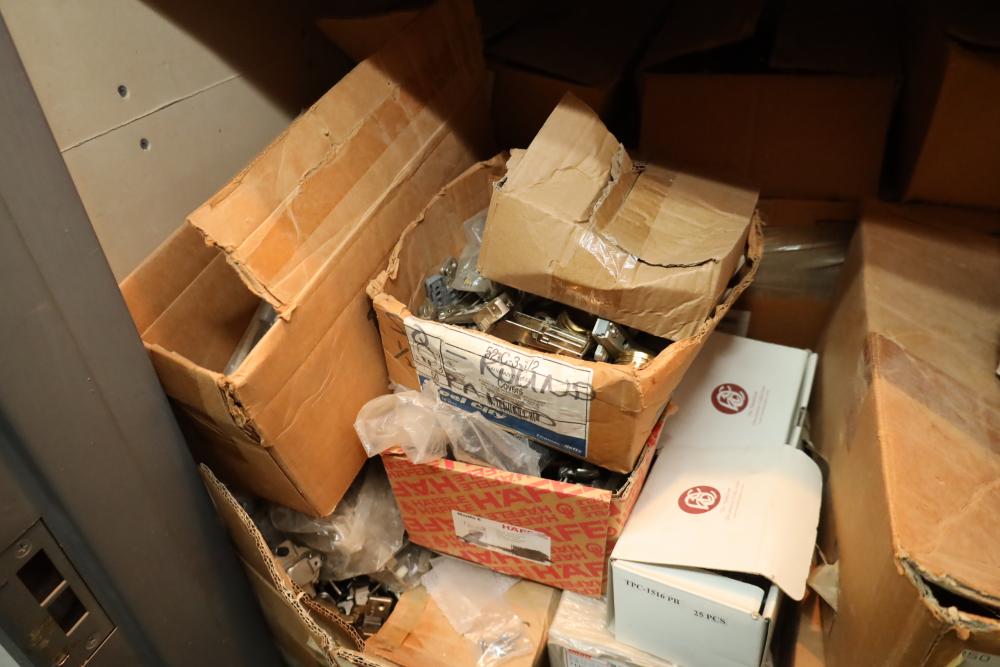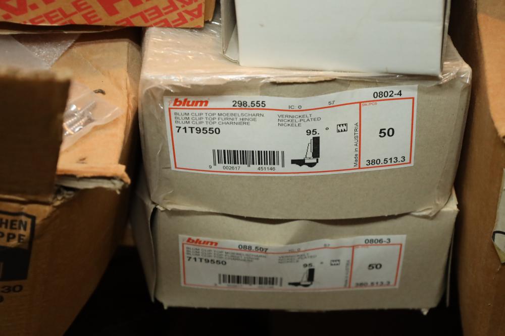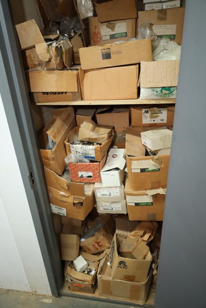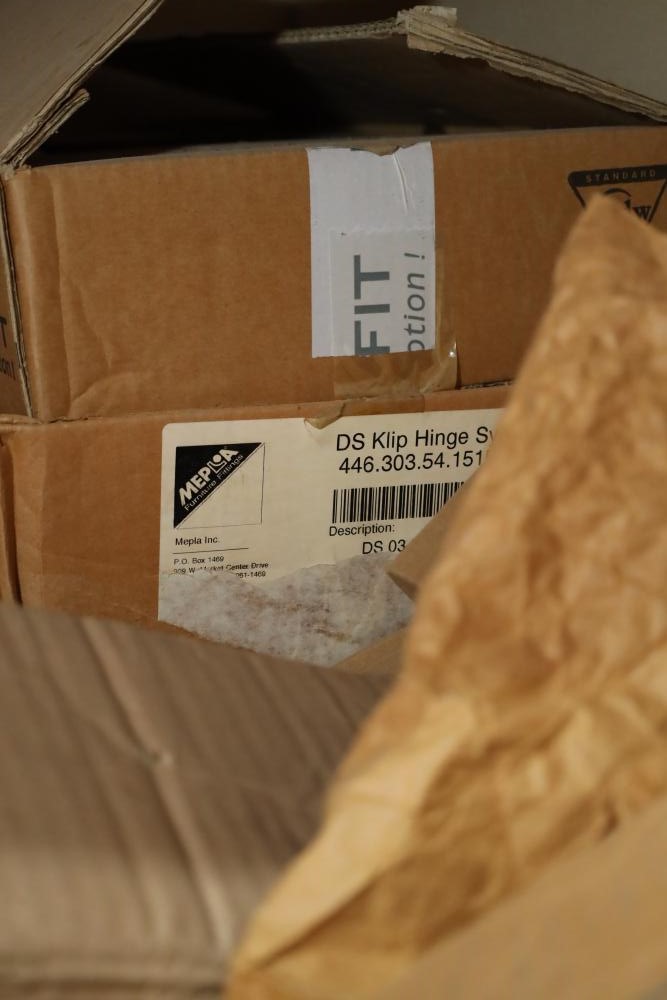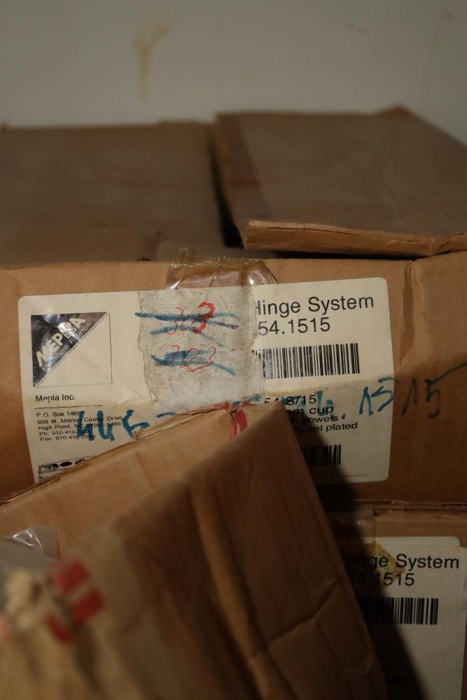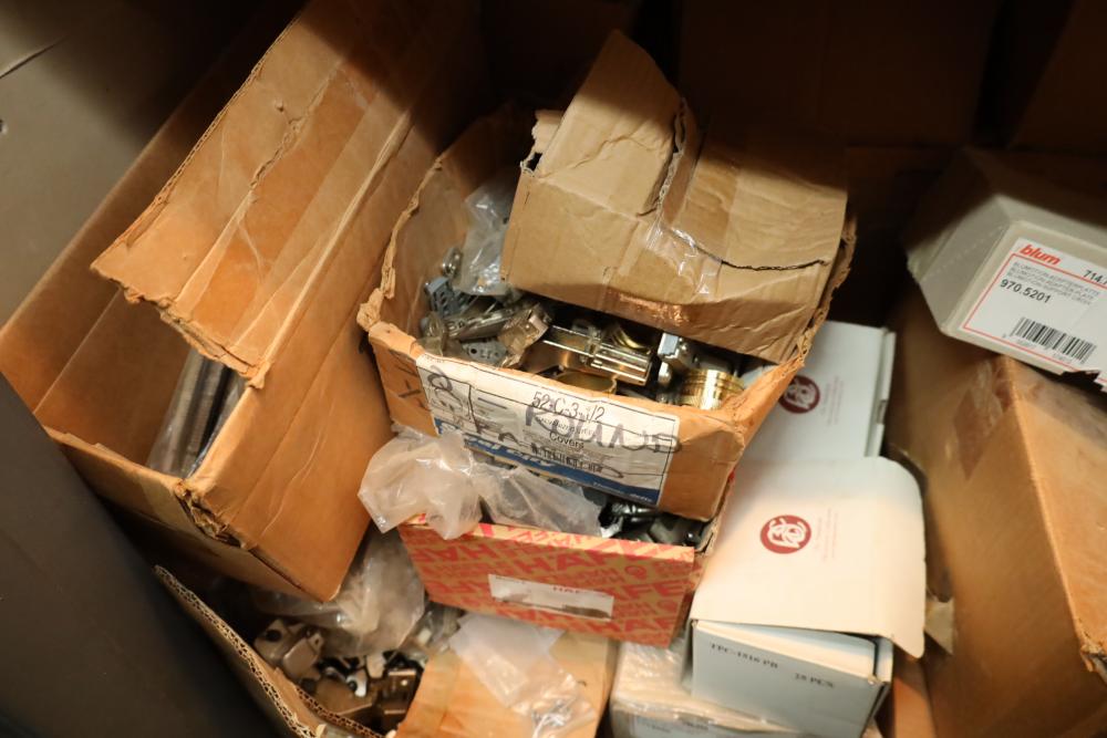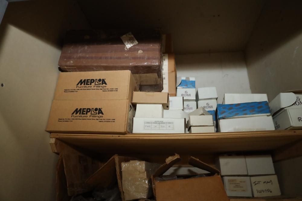 Contents of closet number one including mepla furniture fittings, cabinetry hardware, hinges, adapter plates, gas springs, Blum clip top furniture hinge, shelf pegs, etc. Buyer must take all. Buyer is responsible for the proper and safe removal to the first disconnect including bringing all the proper tools, equipment, supplies, and help. There will NOT be any help or equipment onsite to assist in removal.
