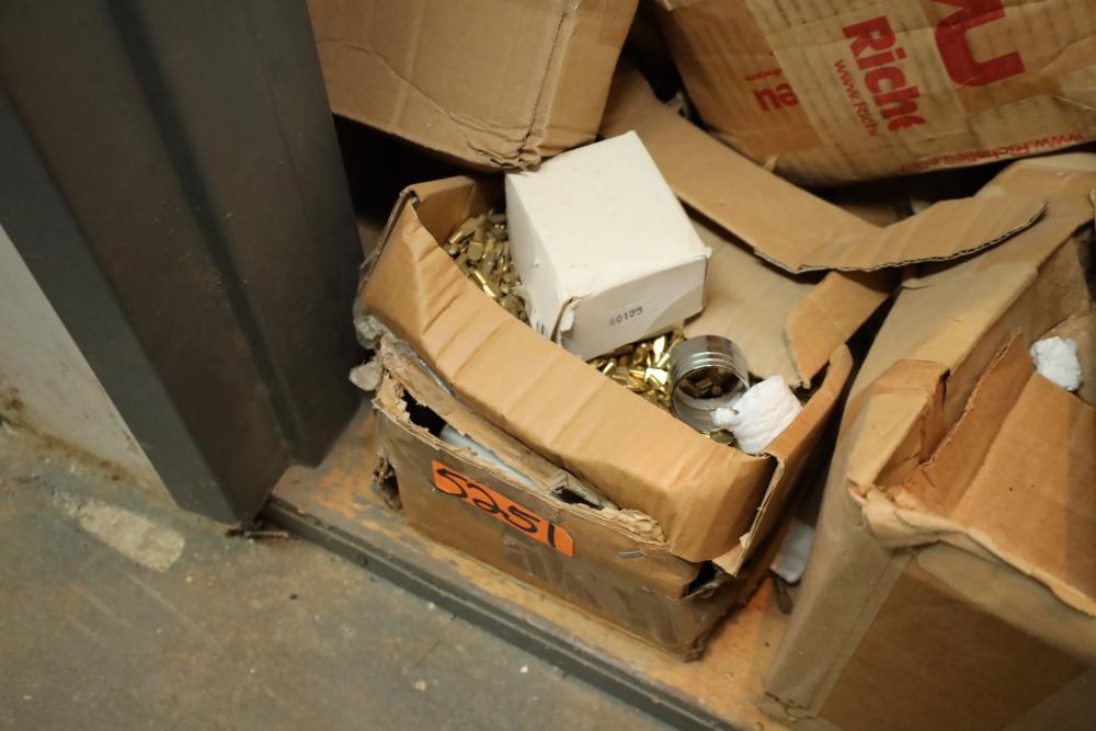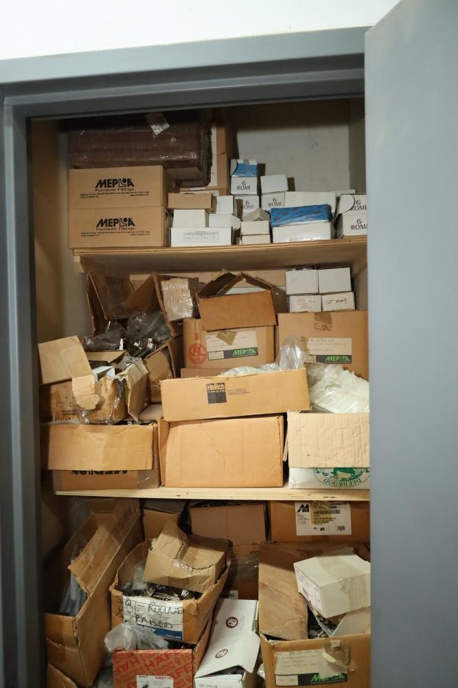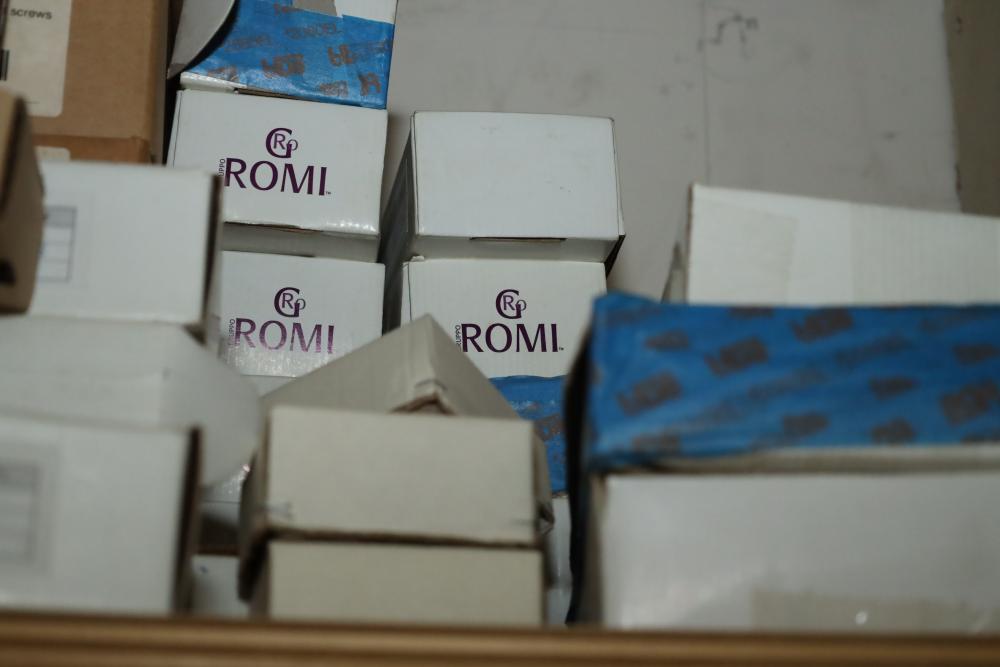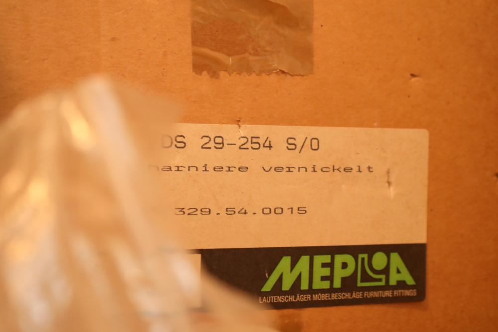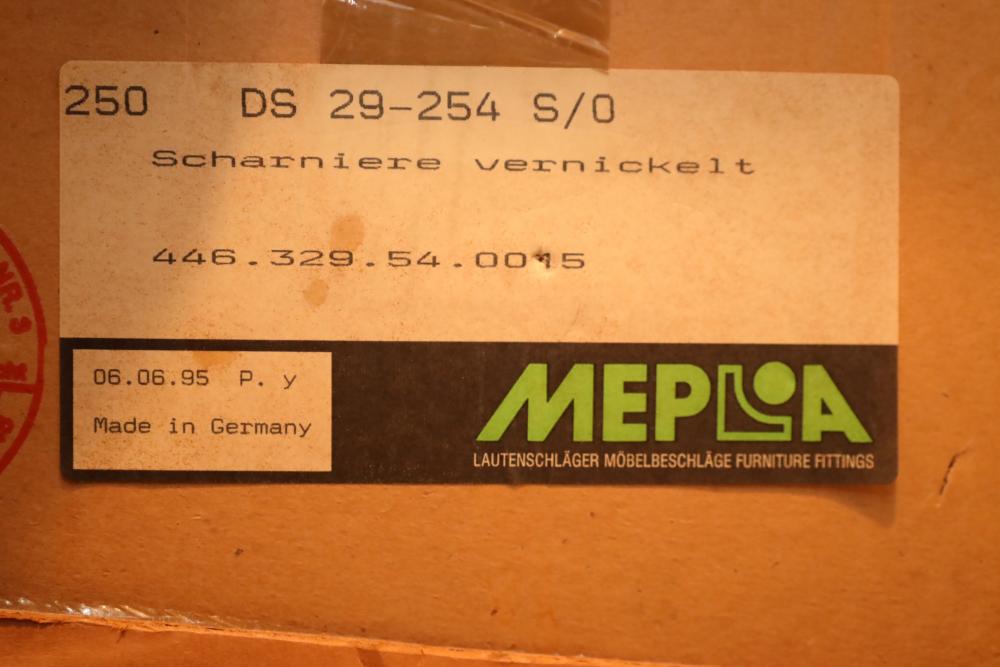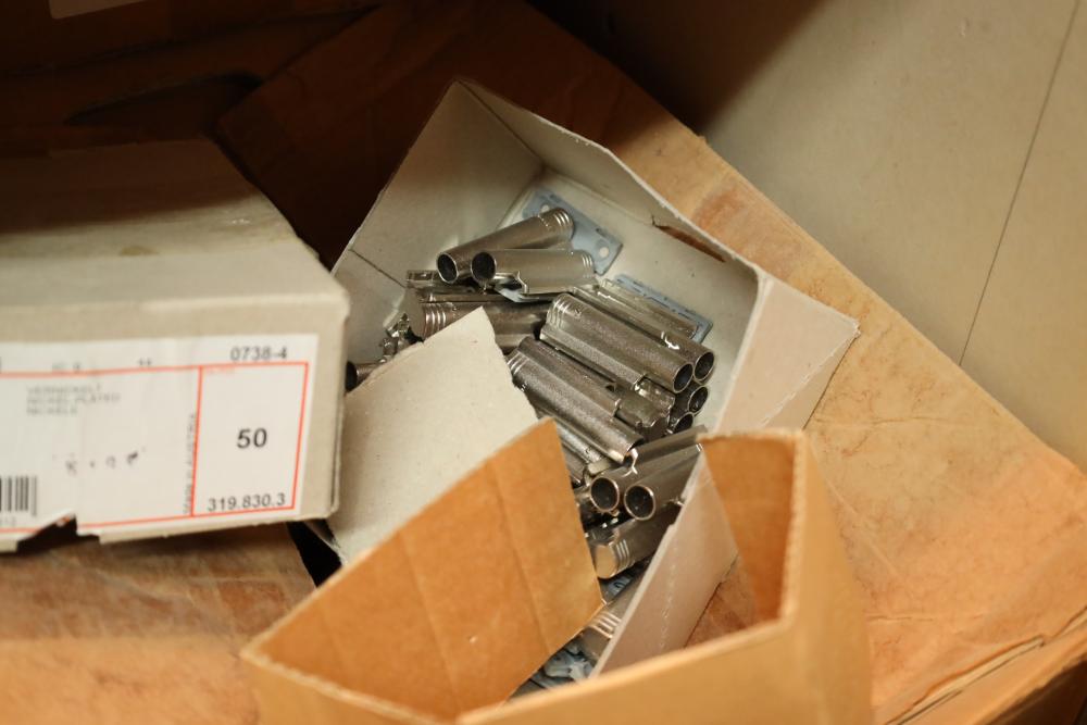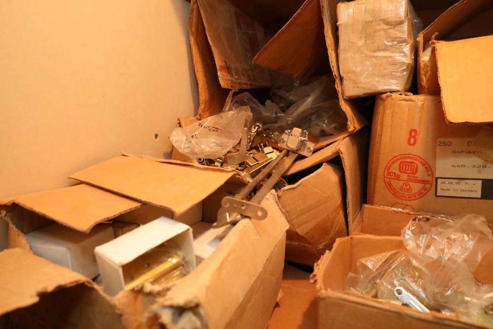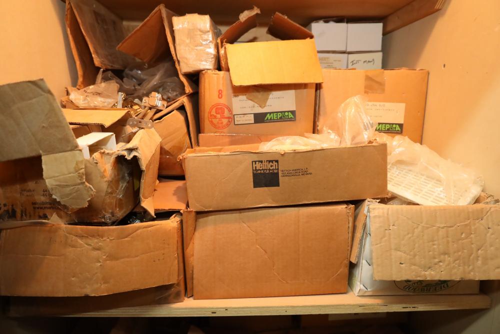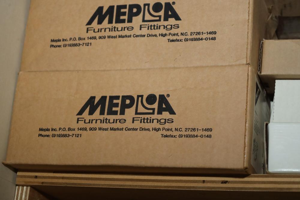 Contents of closet number one including mepla furniture fittings, cabinetry hardware, hinges, adapter plates, gas springs, Blum clip top furniture hinge, shelf pegs, etc. Buyer must take all. Buyer is responsible for the proper and safe removal to the first disconnect including bringing all the proper tools, equipment, supplies, and help. There will NOT be any help or equipment onsite to assist in removal.
