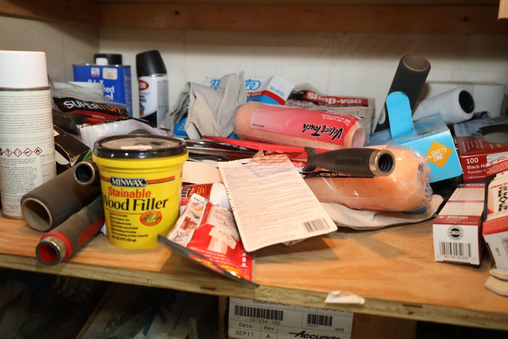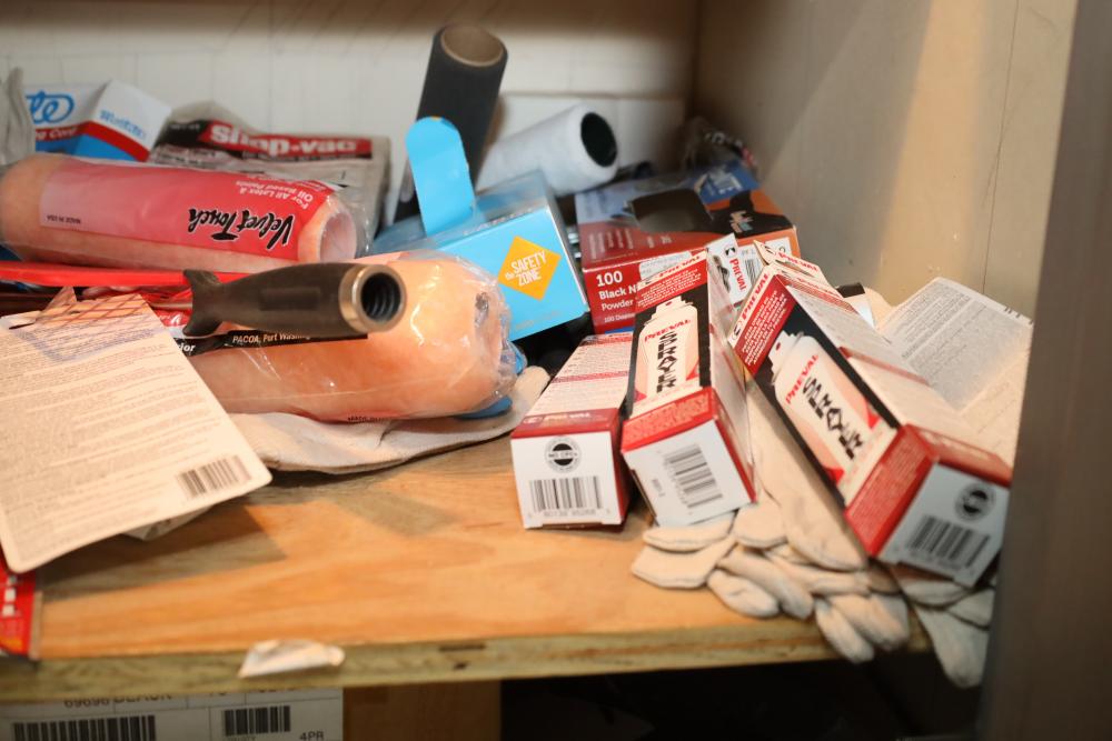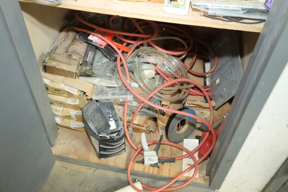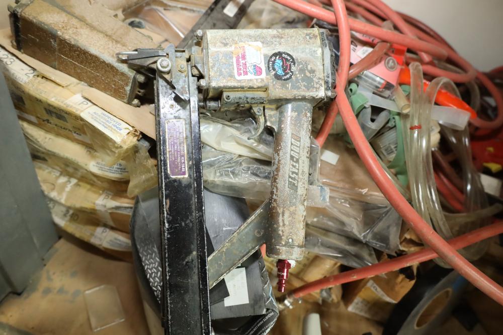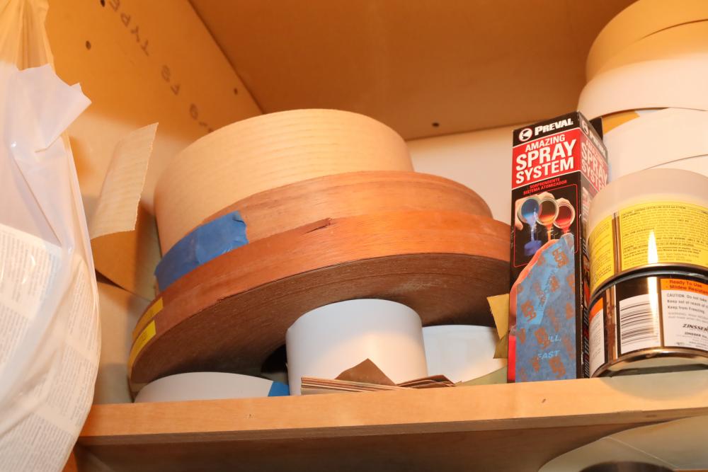 Contents of closet number 6 including rolls of veneer, cabinetry hardware, accuride drawer slides, arrow fastener electric stapler, duofast pneumatic finishing tools, respirator, etc. Buyer must take all. Buyer is responsible for the proper and safe removal to the first disconnect including bringing all the proper tools, equipment, supplies, and help. There will NOT be any help or equipment onsite to assist in removal.