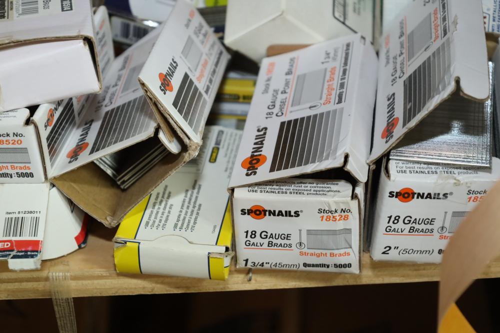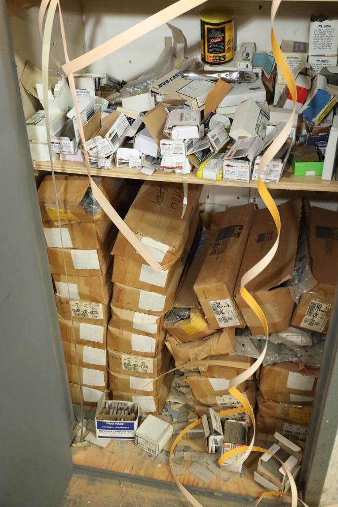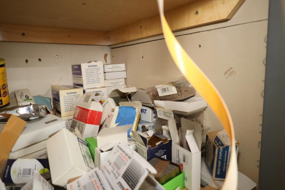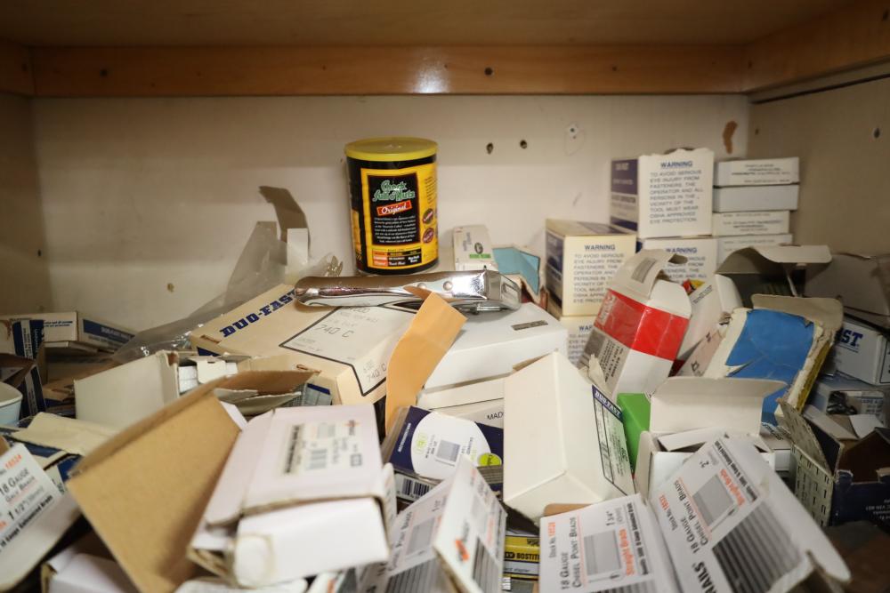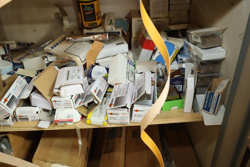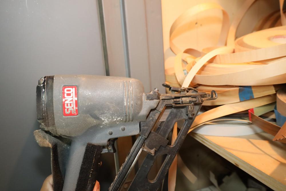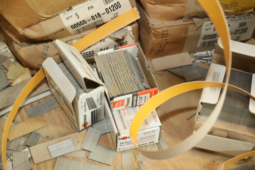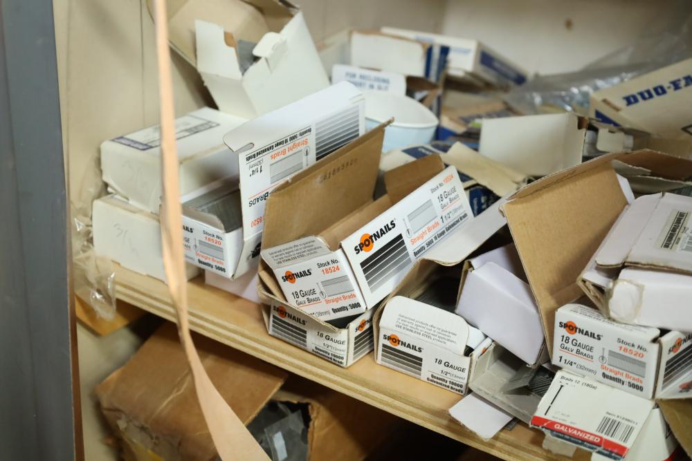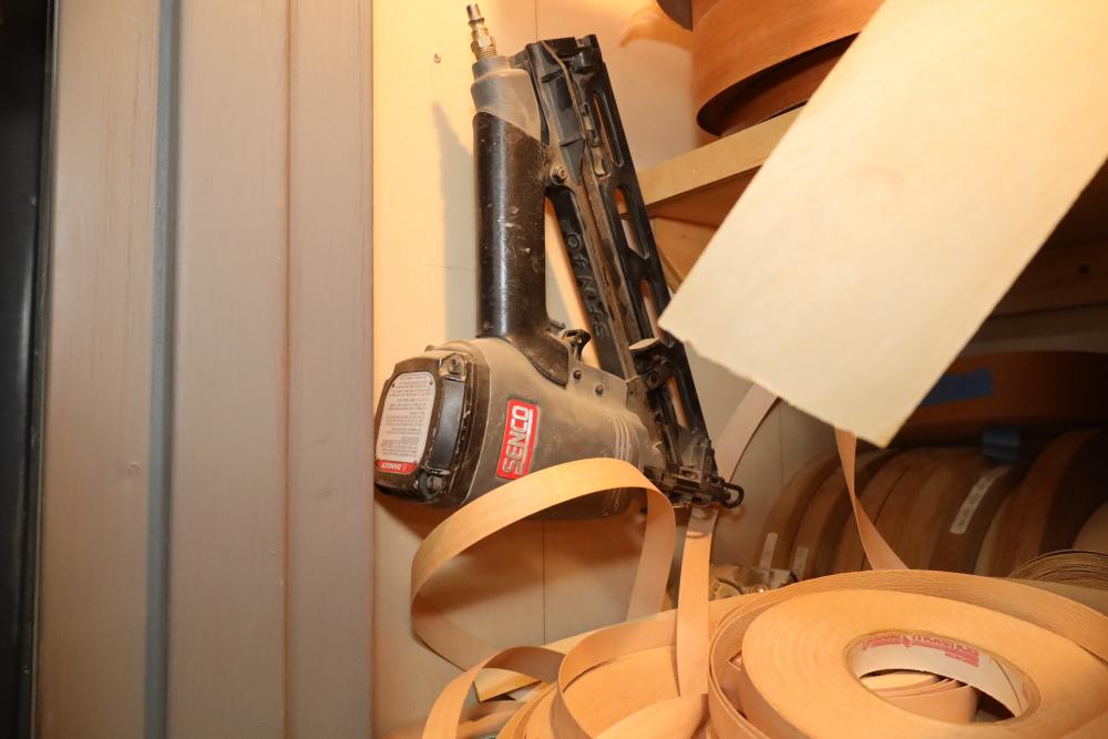 Contents of closet number 7 including rolls of veneer, cabinetry hardware, spot nails 18 gauge galv brads, stapler, Senco pneumatic finish nailer, etc. Buyer must take all. Buyer is responsible for the proper and safe removal to the first disconnect including bringing all the proper tools, equipment, supplies, and help. There will NOT be any help or equipment onsite to assist in removal.