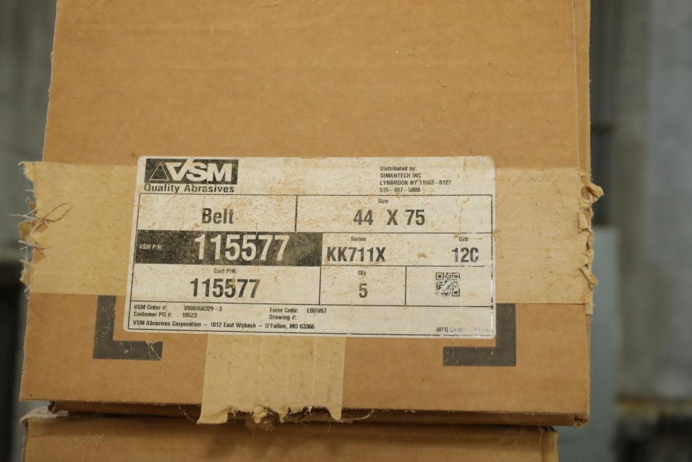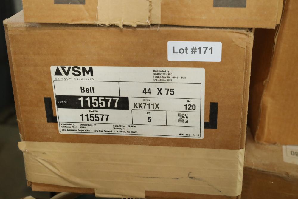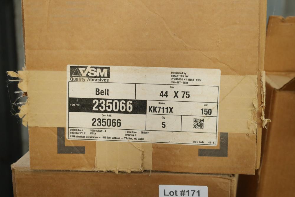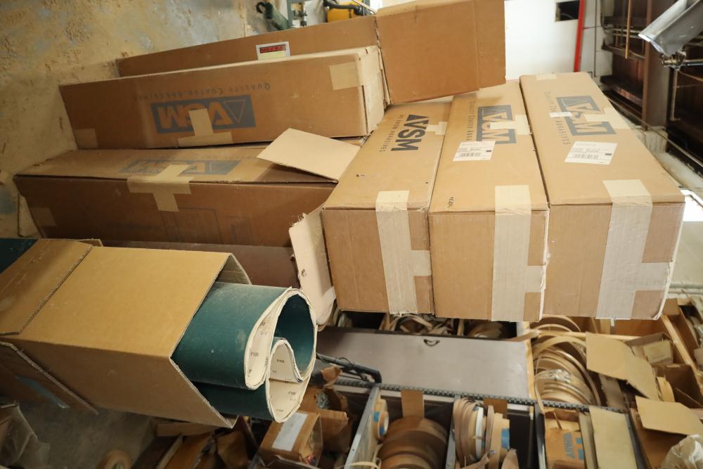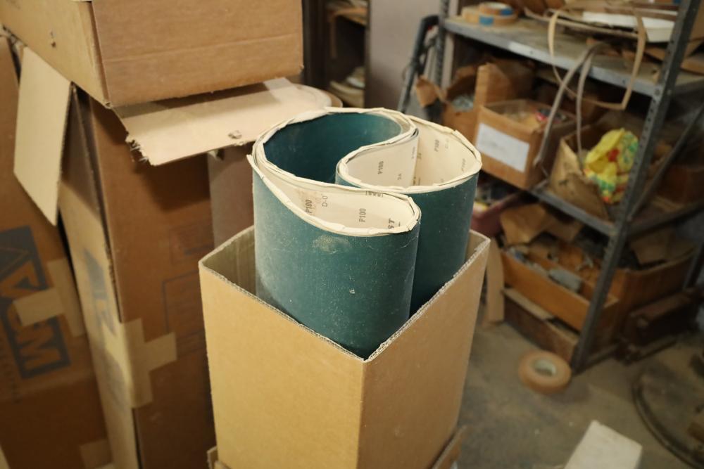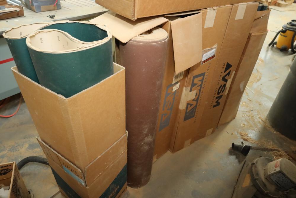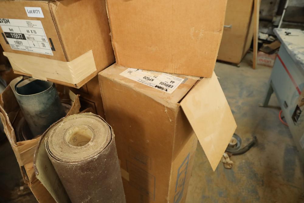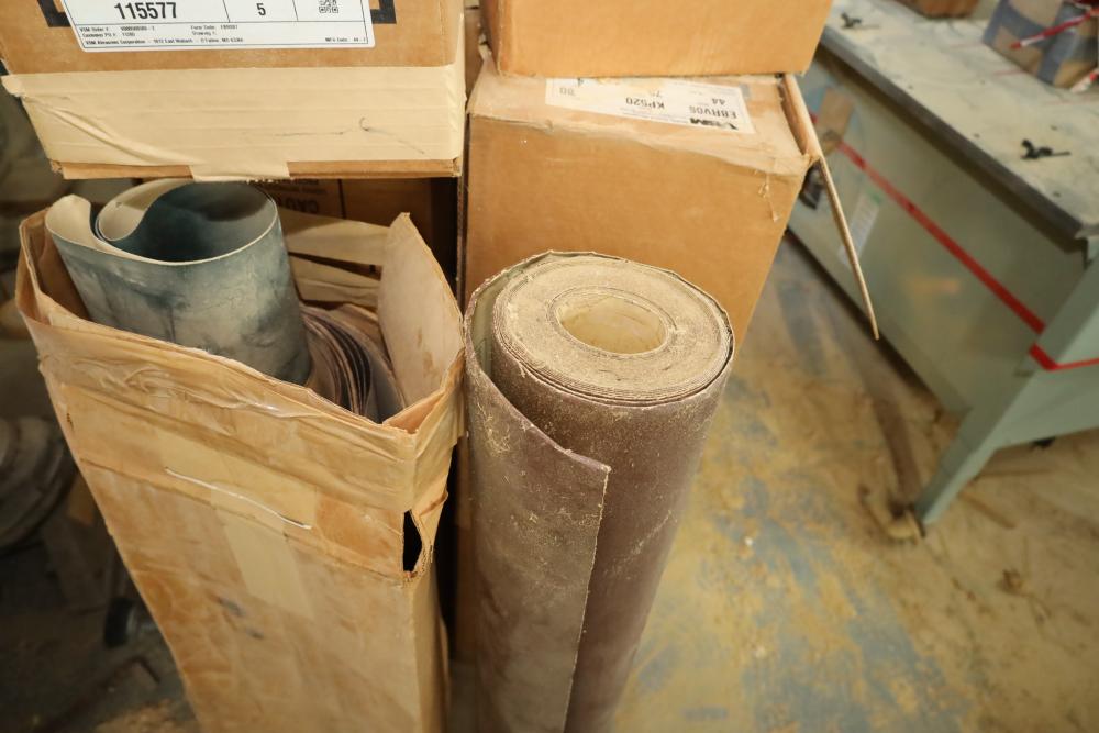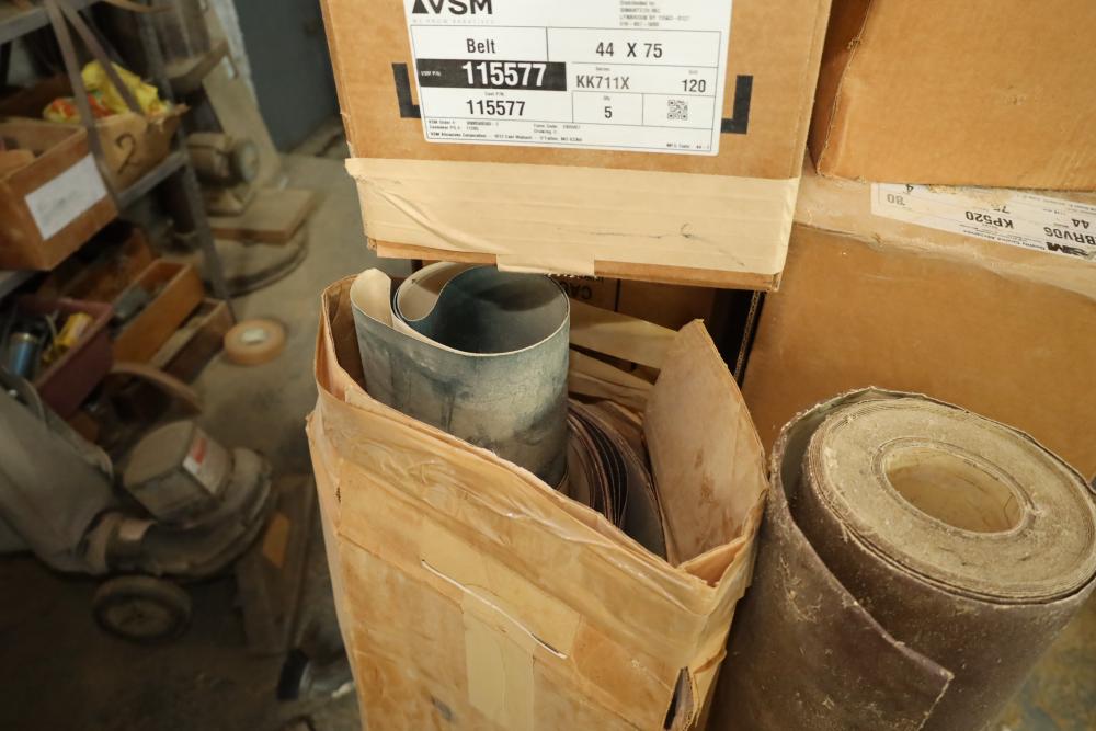 Rolls of belt abrasives, many in boxes marked vsm 44x75 part numbers include 115577, 235066, ebrv06, grips ranging from 75-150. Approx 12 rolls total. Buyer must take all. Buyer is responsible for the proper and safe removal to the first disconnect including bringing all the proper tools, equipment, supplies, and help. There will NOT be any help or equipment onsite to assist in removal.