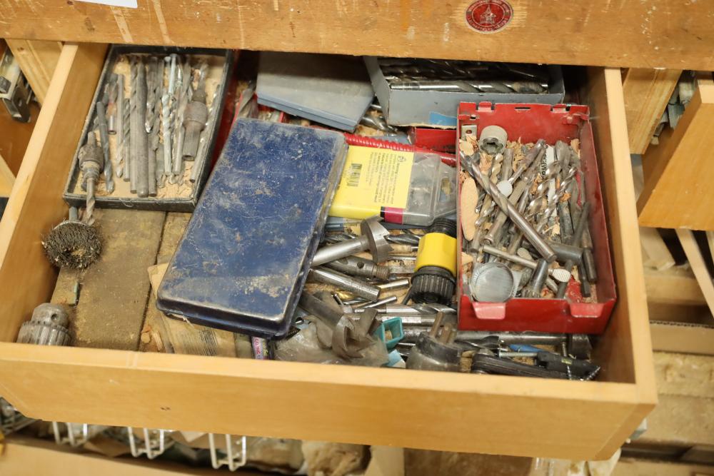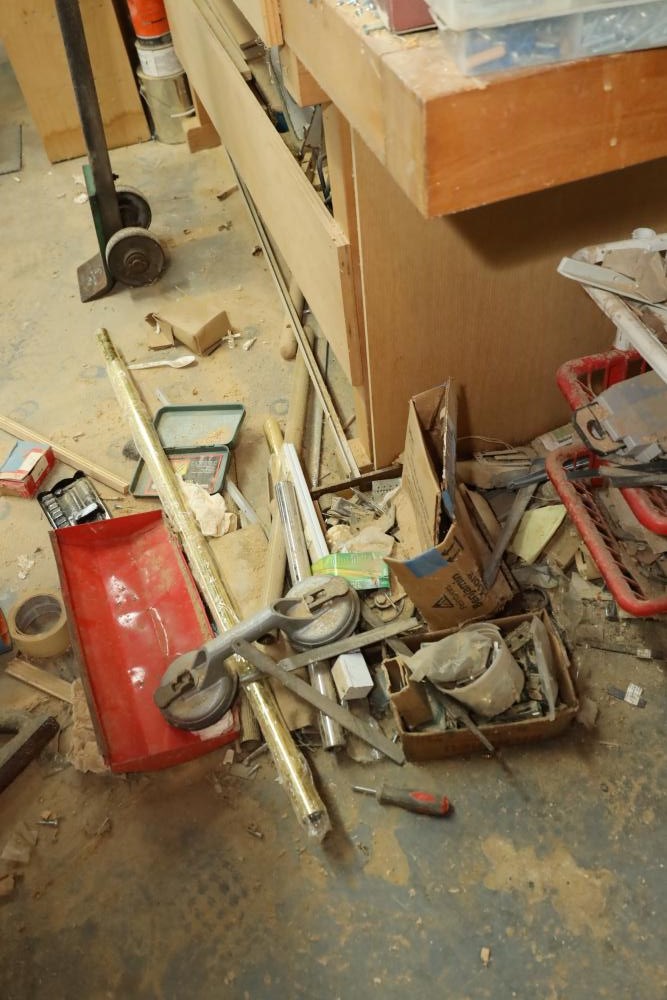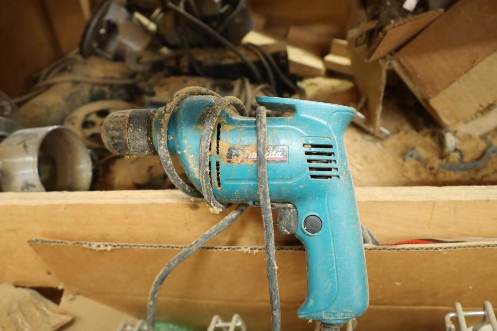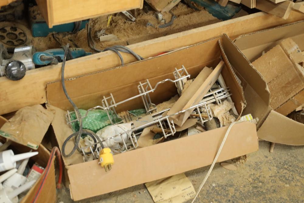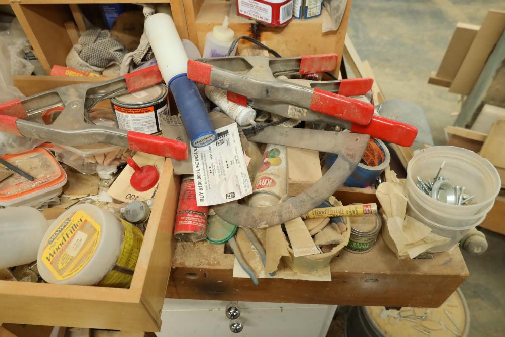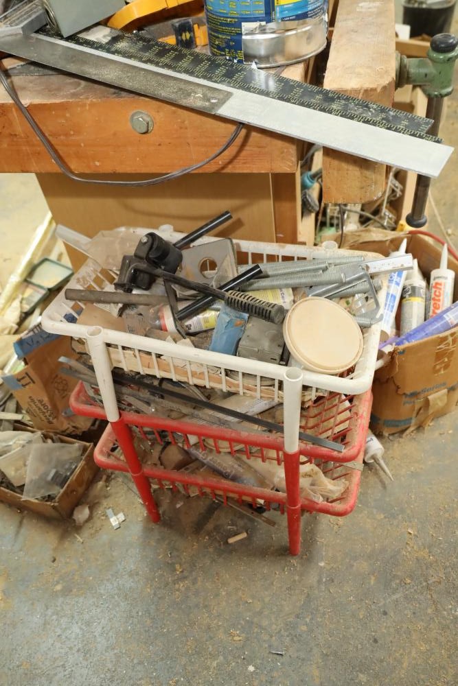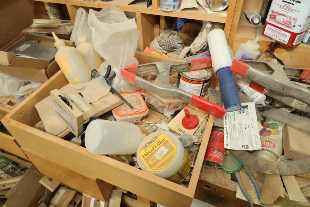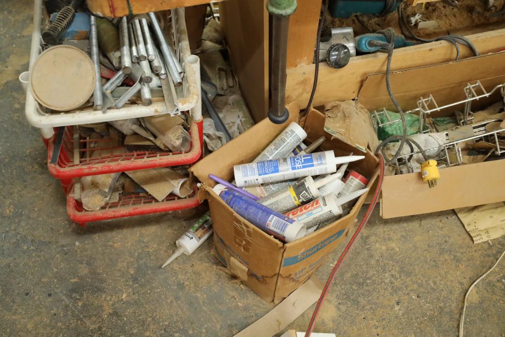 Work bench with assorted tools, equipment, supplies, drill bits, router bits, body filler, screwdrivers, caulk, Makita electric drills, Porter cable laminate trimmer, hinges, etc. Buyer must take all. Buyer is responsible for the proper and safe removal to the first disconnect including bringing all the proper tools, equipment, supplies, and help. There will NOT be any help or equipment onsite to assist in removal.