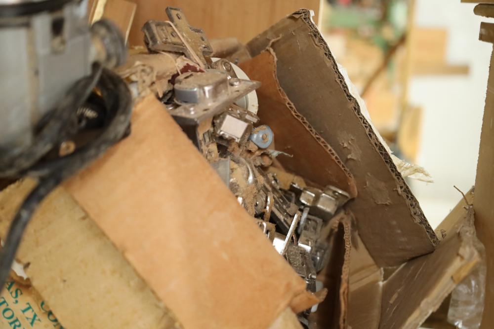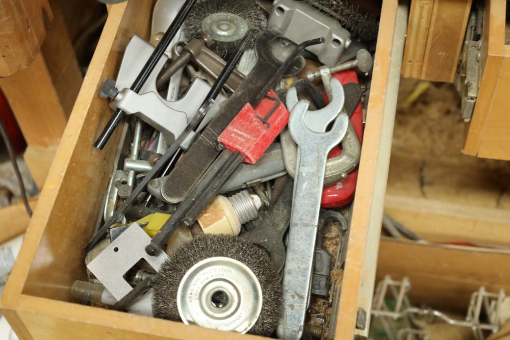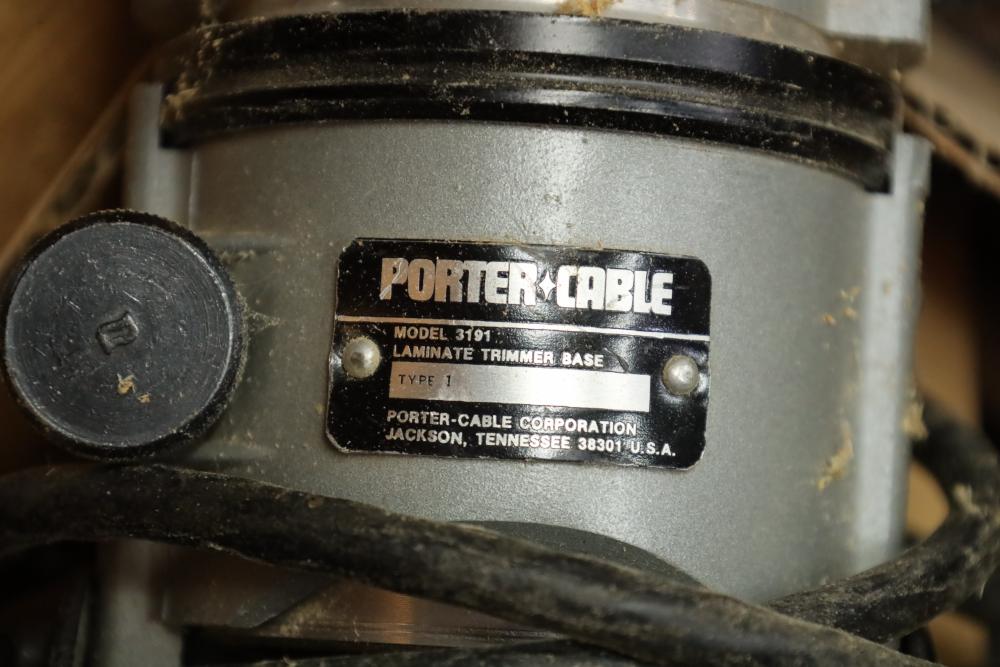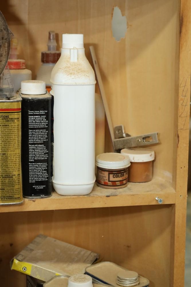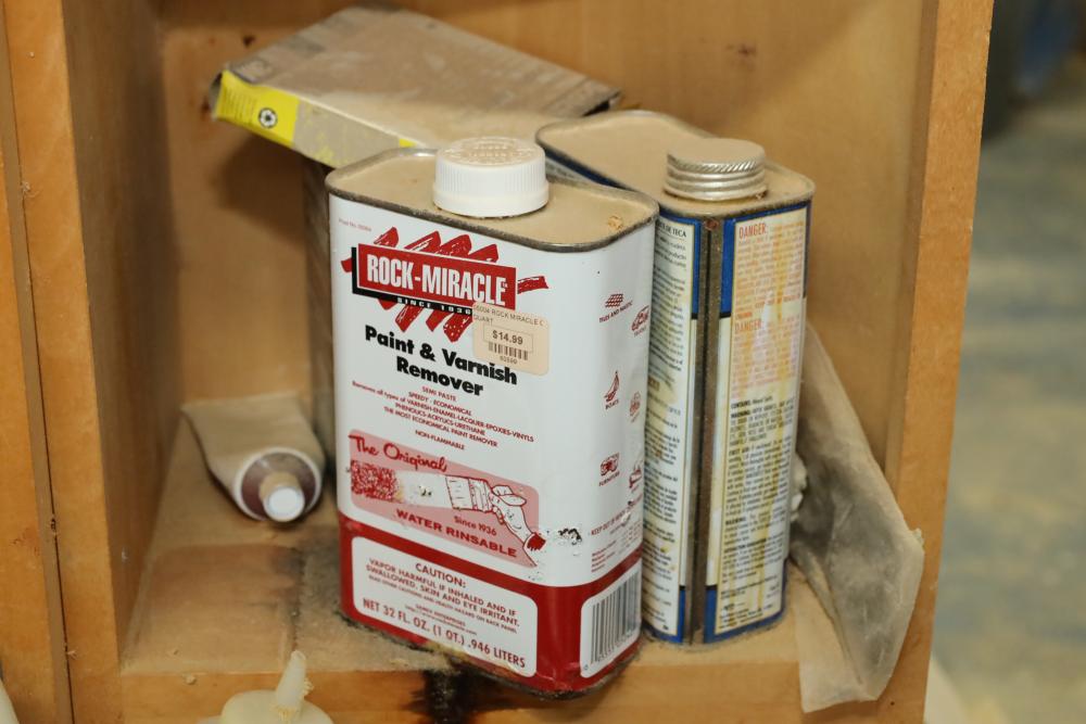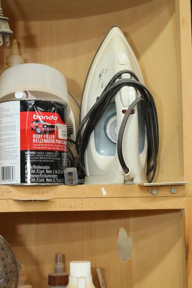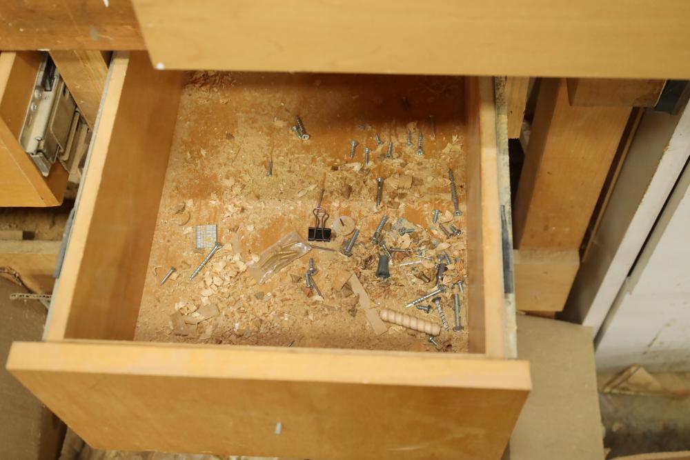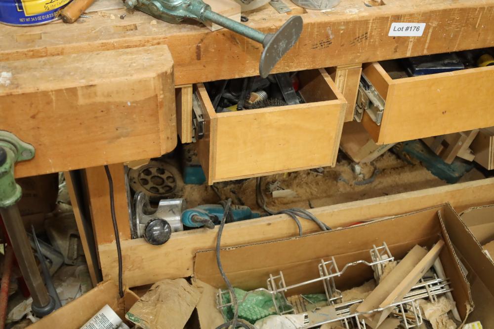 Work bench with assorted tools, equipment, supplies, drill bits, router bits, body filler, screwdrivers, caulk, Makita electric drills, Porter cable laminate trimmer, hinges, etc. Buyer must take all. Buyer is responsible for the proper and safe removal to the first disconnect including bringing all the proper tools, equipment, supplies, and help. There will NOT be any help or equipment onsite to assist in removal.