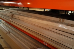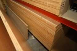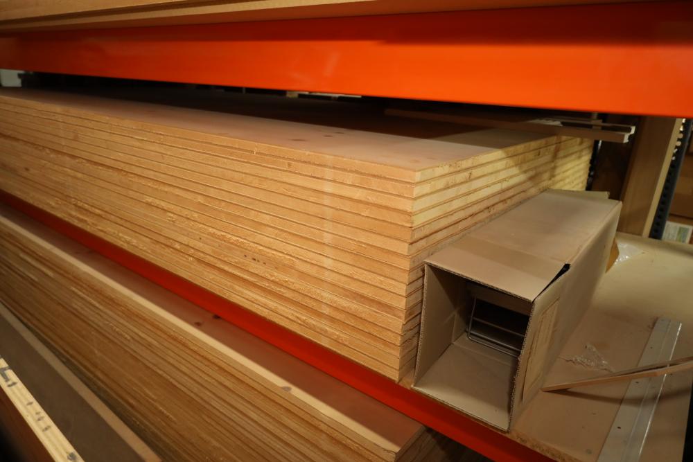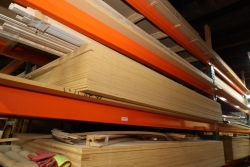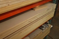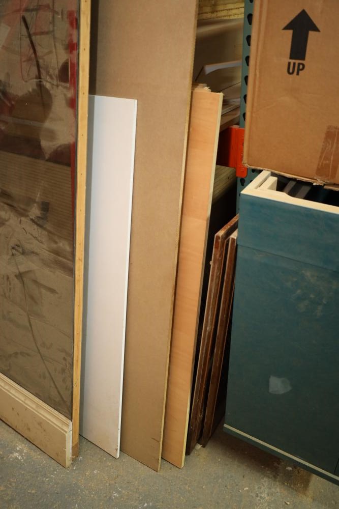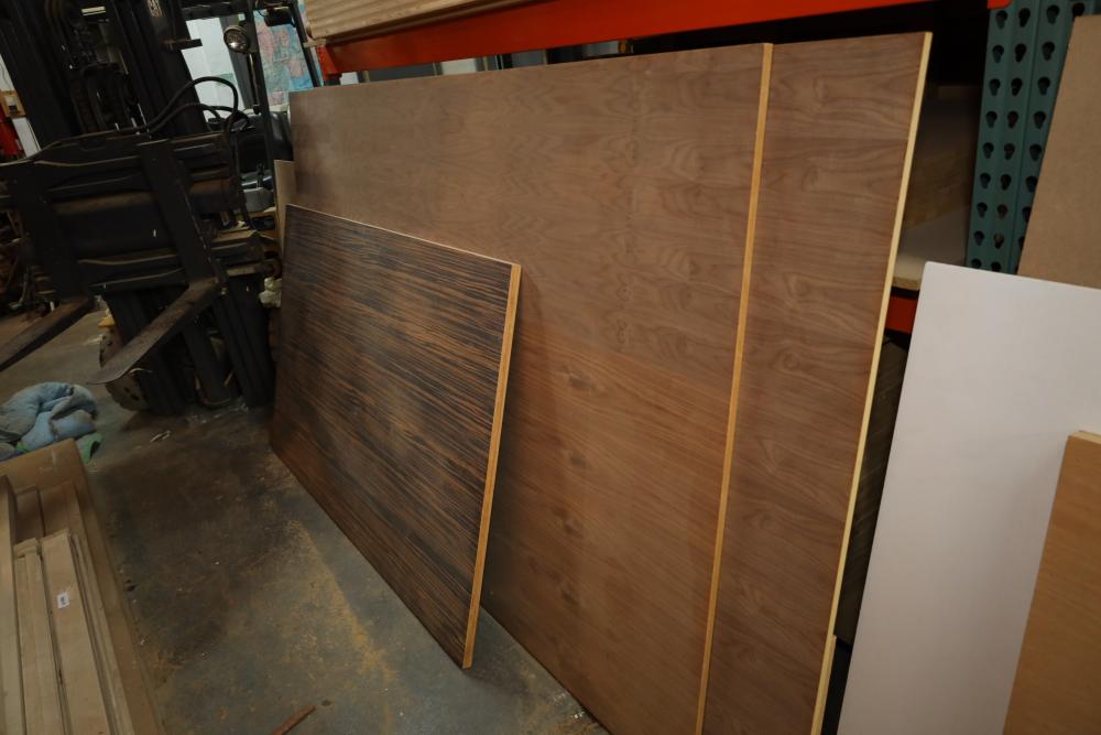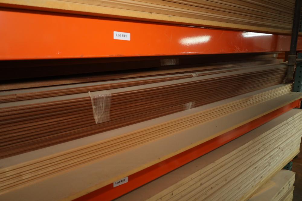 Assorted plywood and MDF leaning against pallet shelving in varying size and style. Six sheets measuring 4'x10'x.75 Buyer must take all. Buyer is responsible for the proper and safe removal to the first disconnect including bringing all the proper tools, equipment, supplies, and help. There will NOT be any help or equipment onsite to assist in removal.