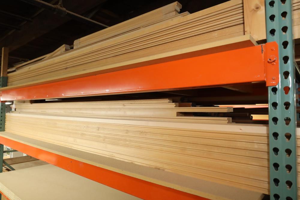 Six shelves of assorted stock including lumber core, shutters, rounded trim, plywood, particle board, MDF, veneer, etc. See photos for quantity. Buyer must take all. Buyer is responsible for the proper and safe removal to the first disconnect including bringing all the proper tools, equipment, supplies, and help. There will NOT be any help or equipment onsite to assist in removal.