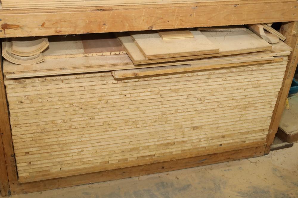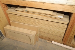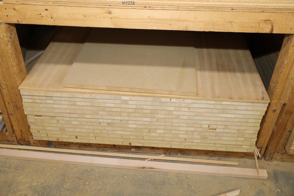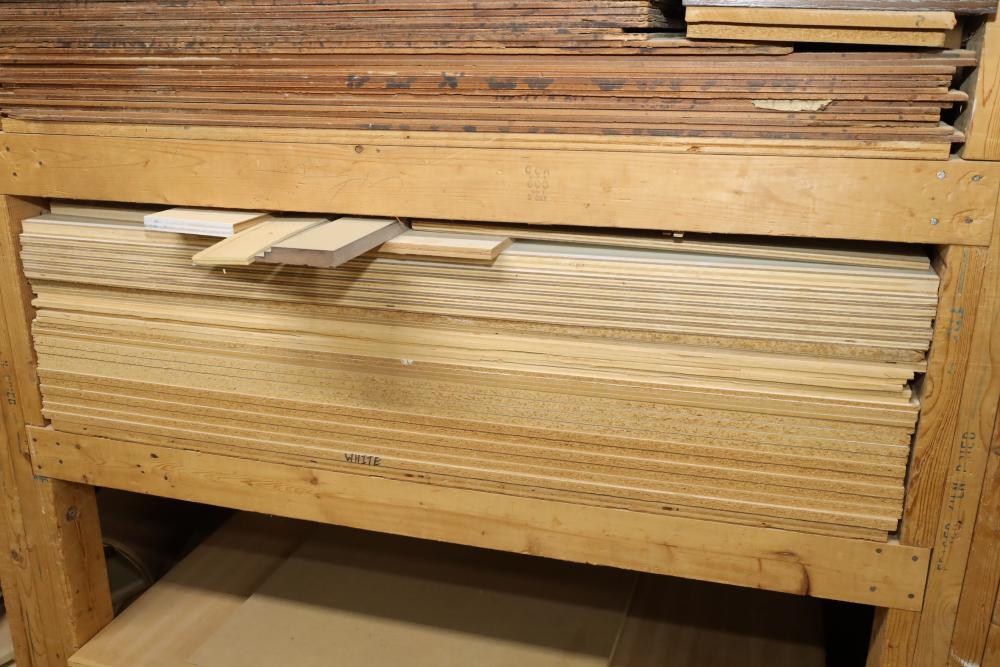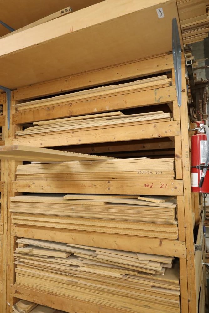 One shelf of lumber core 4'x8'x3/4, approx. 28 pieces. Also including assorted wood stock. Buyer must take all. Buyer is responsible for the proper and safe removal to the first disconnect including bringing all the proper tools, equipment, supplies, and help. There will NOT be any help or equipment onsite to assist in removal.