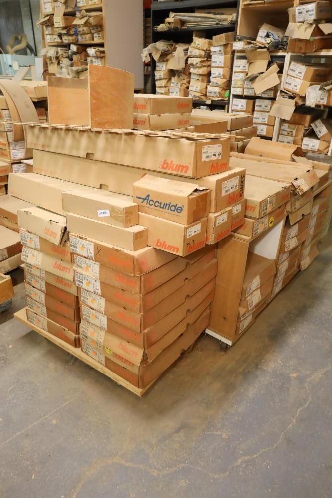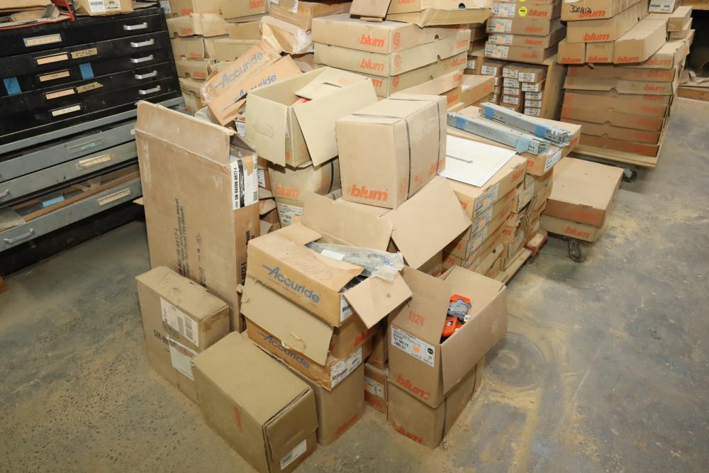 Large quantity of cabinetry hardware including accuride part number c 3222-14D, Blum tandem locking device, Blum left locking mechanism, Blum tandem full extension runner set for 12, 18, and 24 drawers, etc. Buyer must take all. Buyer is responsible for the proper and safe removal to the first disconnect including bringing all the proper tools, equipment, supplies, and help. There will NOT be any help or equipment onsite to assist in removal.