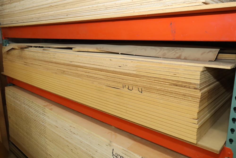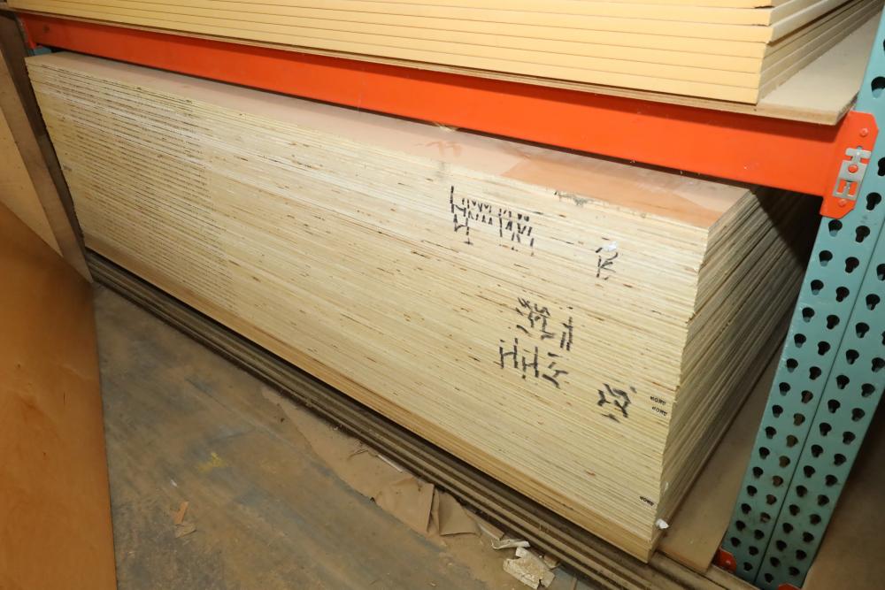 Contents of pallet shelf including sheet stock measuring 4'x8'x1/4. Over 40 pieces in total. Buyer must take all. Buyer is responsible for the proper and safe removal to the first disconnect including bringing all the proper tools, equipment, supplies, and help. There will NOT be any help or equipment onsite to assist in removal.