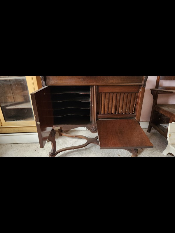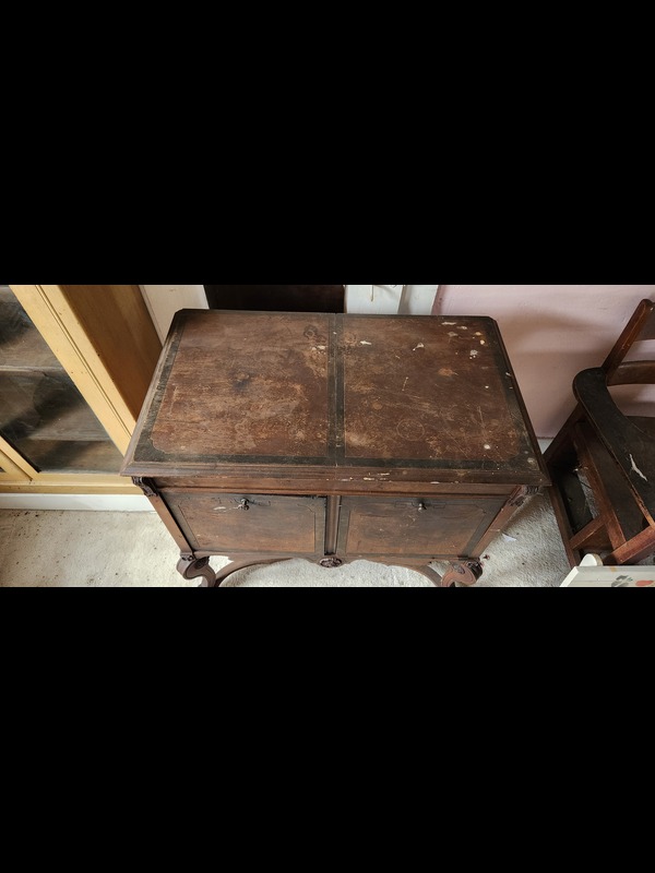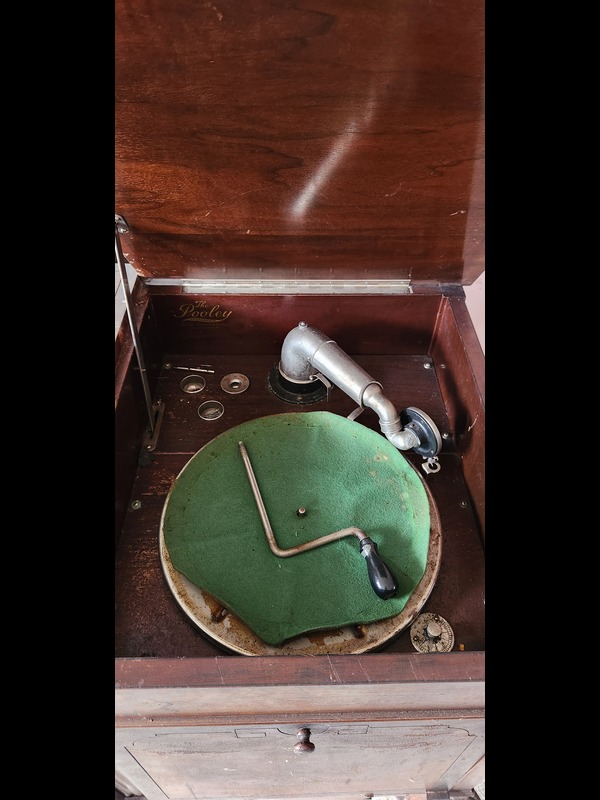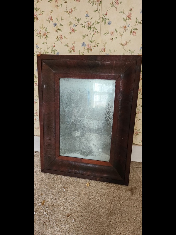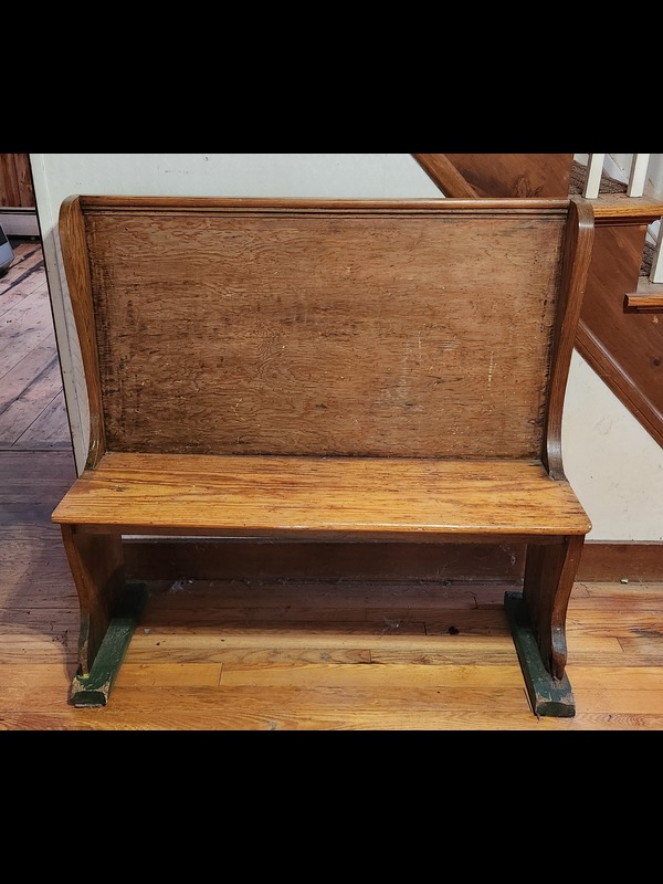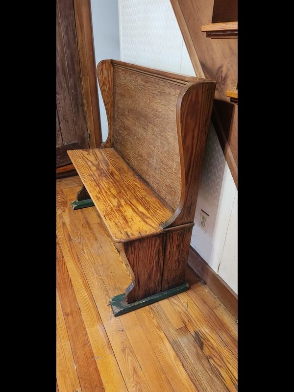 Antique Phonograph Cabinet, Entry Bench, and Mirror. Antique phonograph in cabinet with needles & crank, 3'Wx21"Dx34.5"H (right door needs repair; top stained); antique mirror, 20.5"x27", 4.5"wood frame; church pew, 45"Wx17.5"Dx43"H. Phono & mirror Located on the second floor.