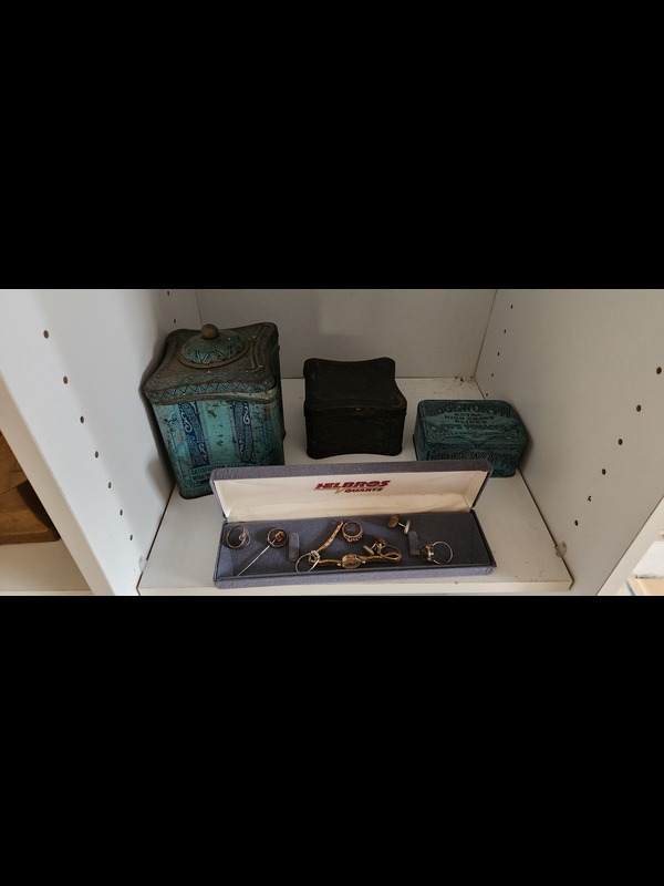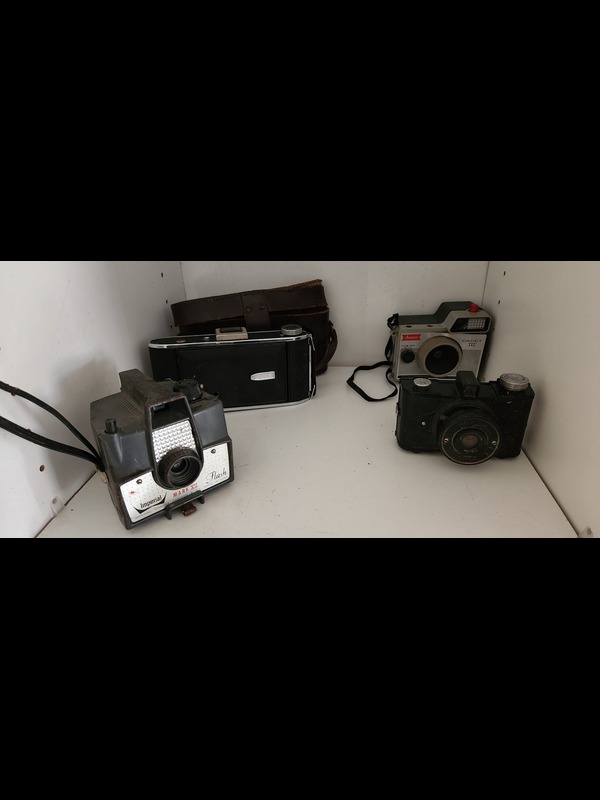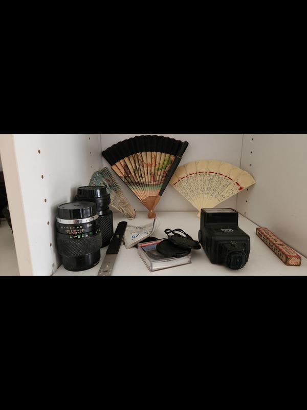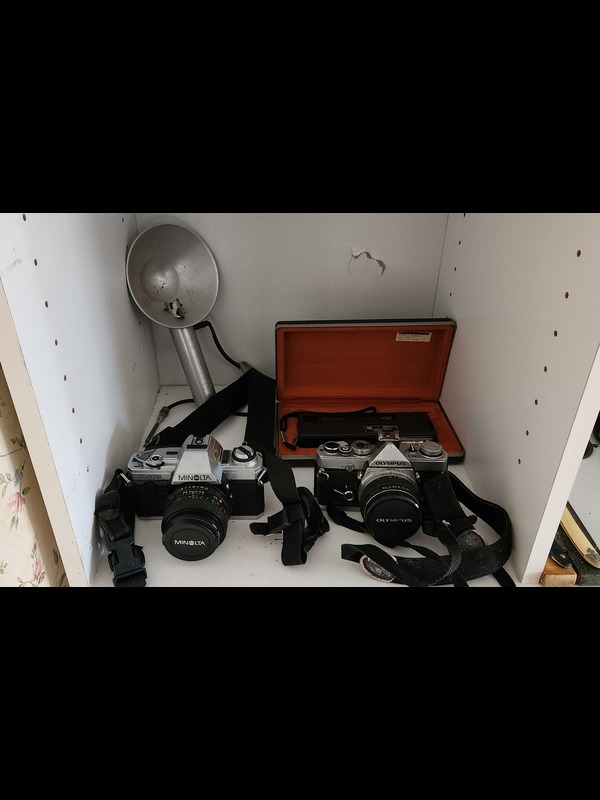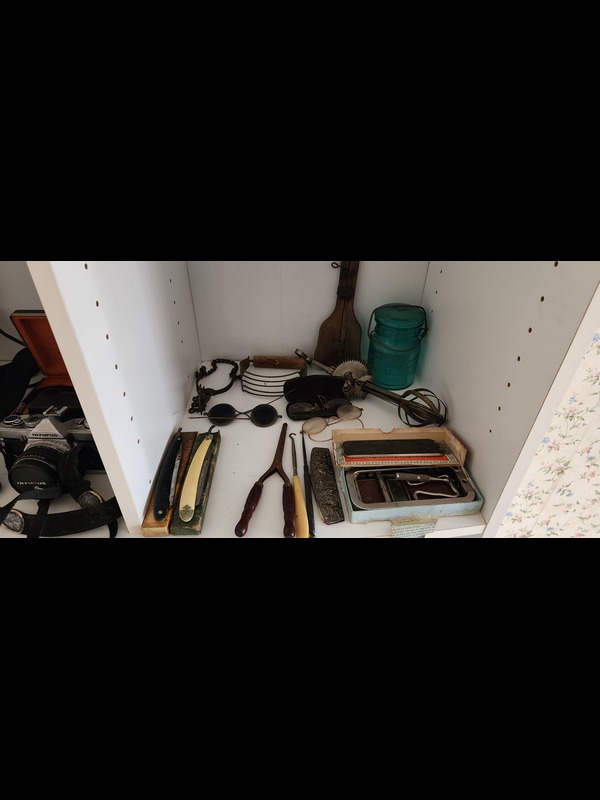 Antique and Vintage Cameras and Collectibles. Seven antique and vintage cameras: Ansco Cadet III, H E Shaw Oxford mini cam, Agfa with case, Imperial Mark XII, Minolta X-370 SLR, Olympus OM-1 SLR, Berkey Keystone 310 with case; two camera lenses; antique & vintage collectibles incl: four folding fans; three metal boxes; five pcs statuary, tallest 17"H; vintage jewelry; two straight razors. See photos for details. Located on the second floor.