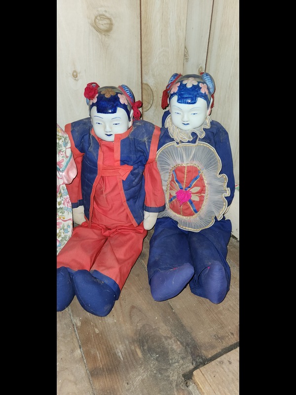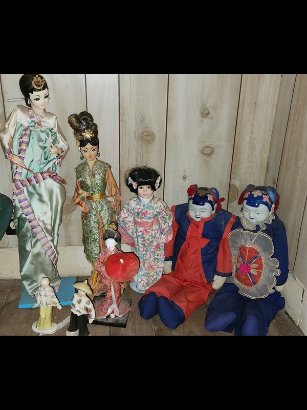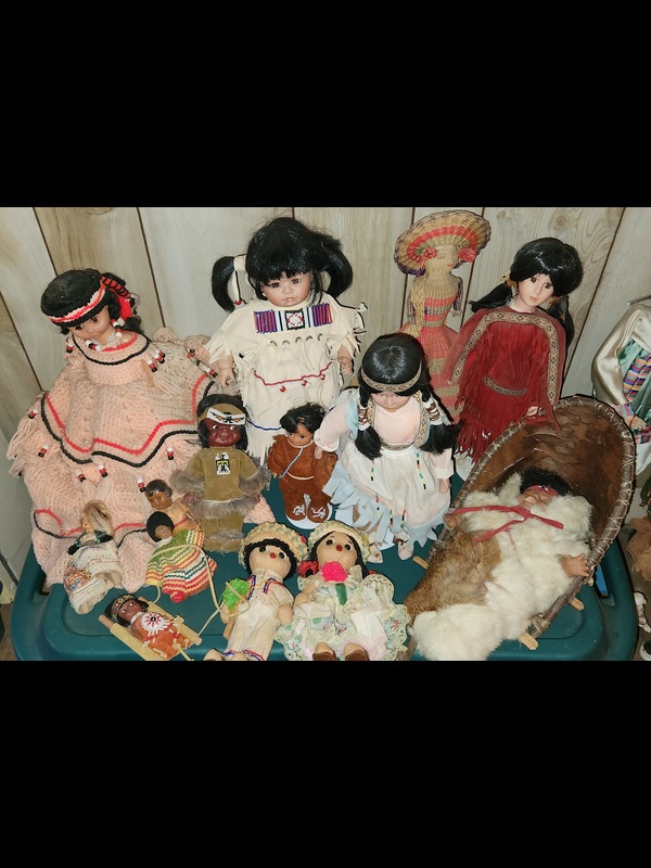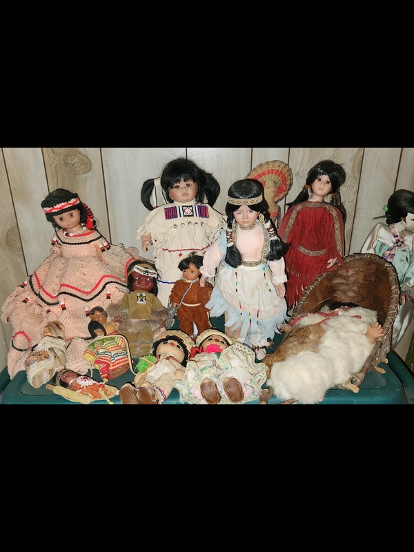 Native American and Oriental Dolls. Native American dolls: five large (three porcelain), eight small, one papoose (porcelain), tallest 16"H; Oriental dolls: three large, three small, tallest 28"H, & set of two porcelain 23.5"H. Bin included Located on the second floor.