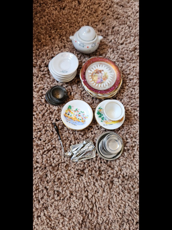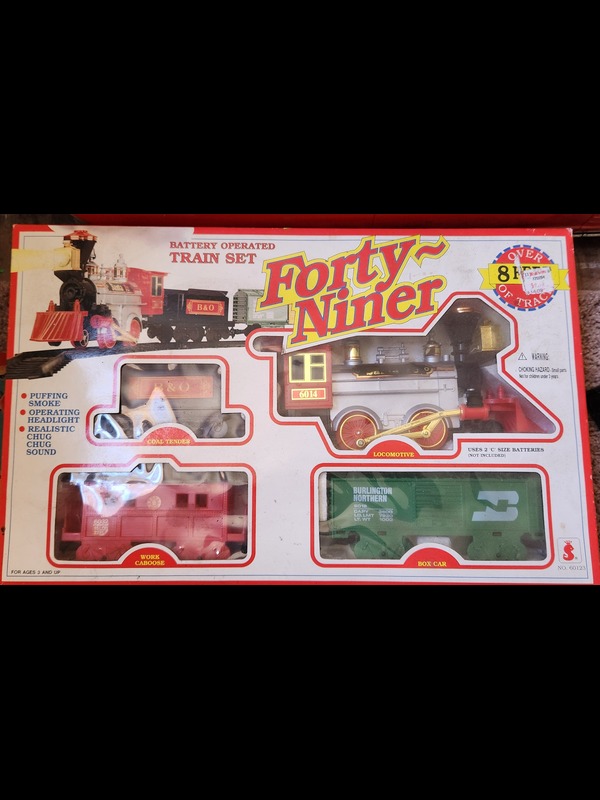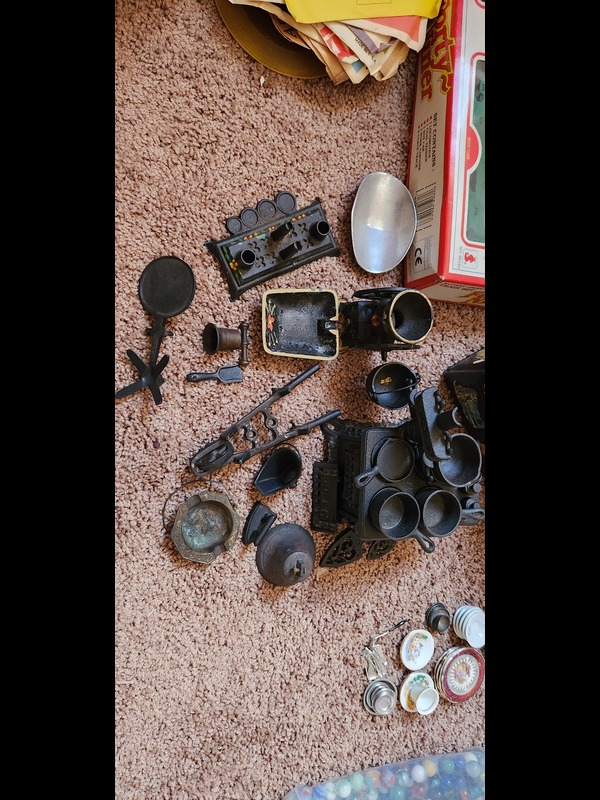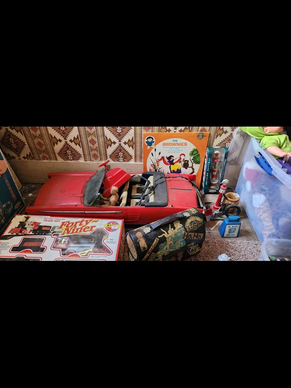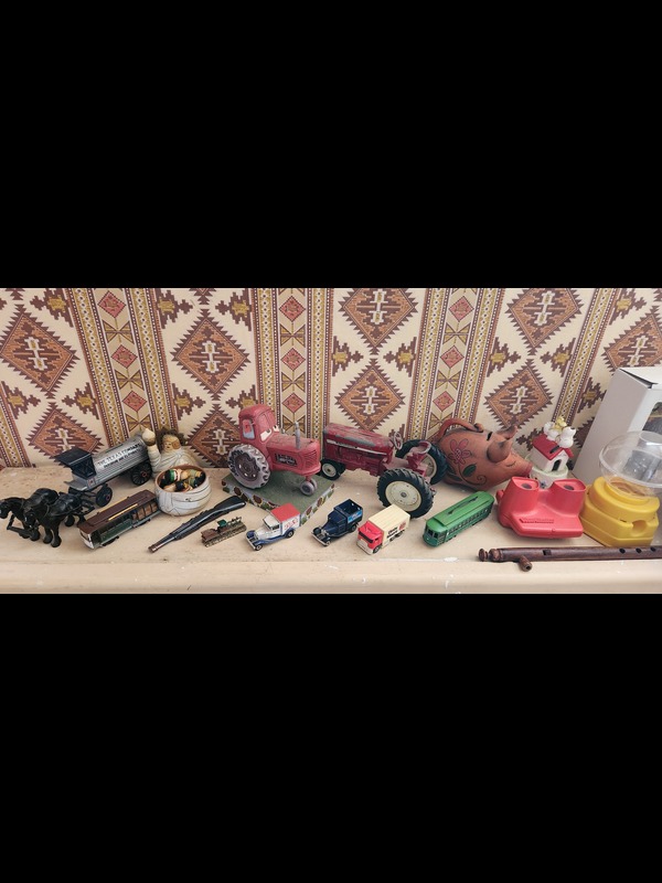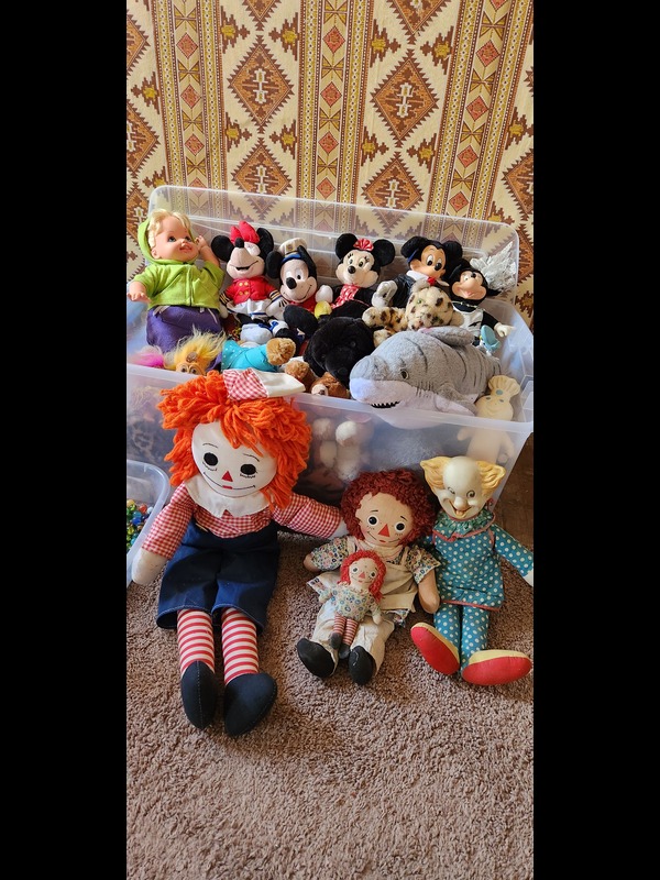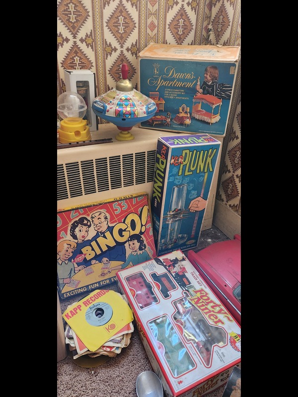 Vintage Toys. Vintage toys incl: remote control car (condition unknown, probably not functional); Forty Niner battery operated train set, in box; Dawn's Apartment, in box; push-down top toy; dolls incl Raggedy Ann, Mickey Mouse; assort stuffed animals; 45 rpm records; metal model vehicles; metal lunch box; mini kitchen set; mini tea set; marbles; other related items as in photos. Located on the second floor.