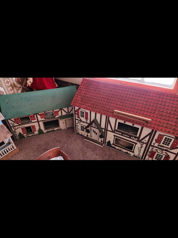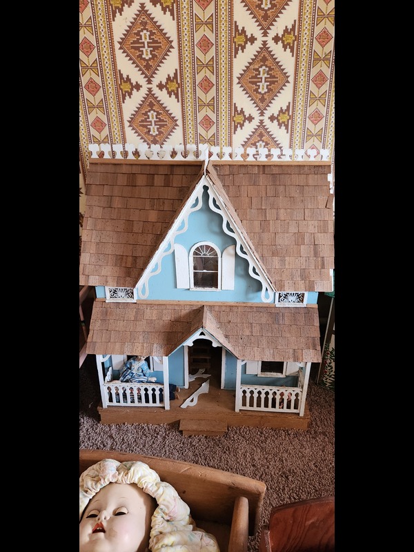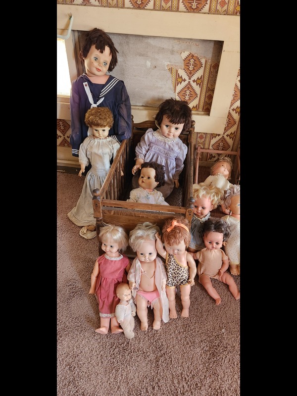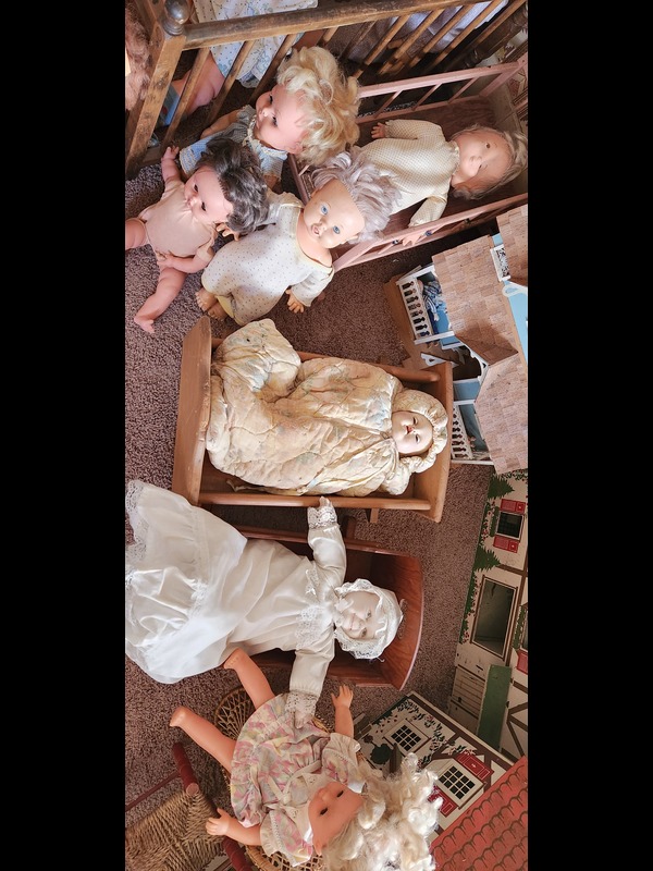 Vintage Doll Houses, Doll Furniture, and Large Dolls. Two metal & one wood vintage doll houses, largest 35"Wx13"Dx21"H; two cribs; two cradles; two doll chairs; 15 large & baby dolls, tallest 3'H. Located on the second floor.