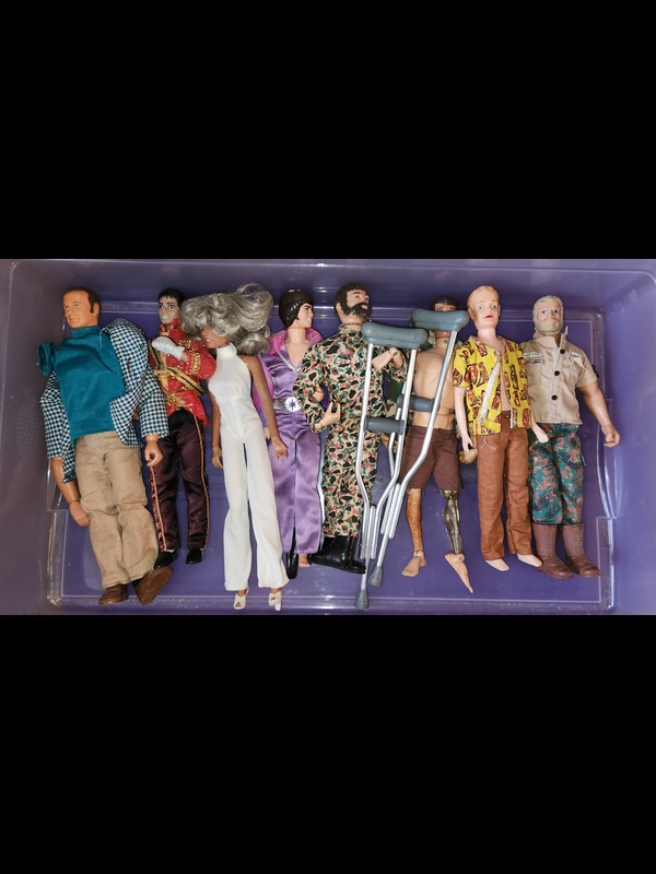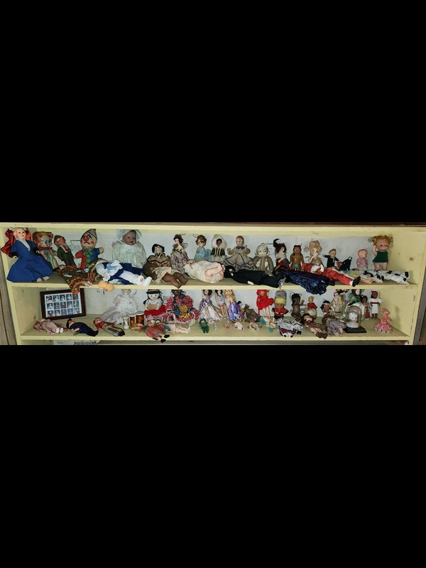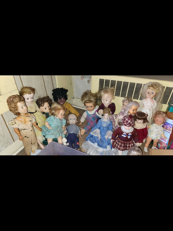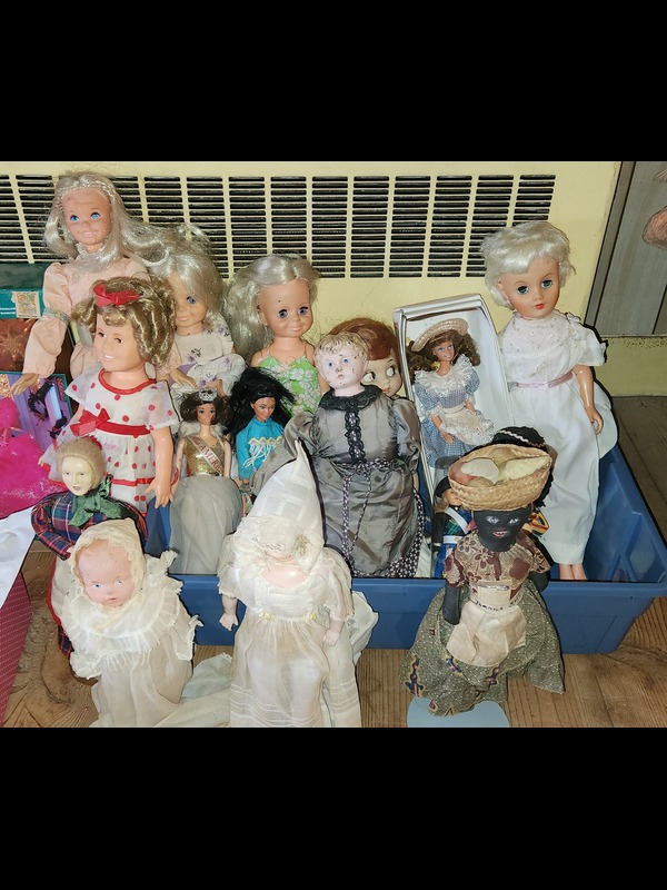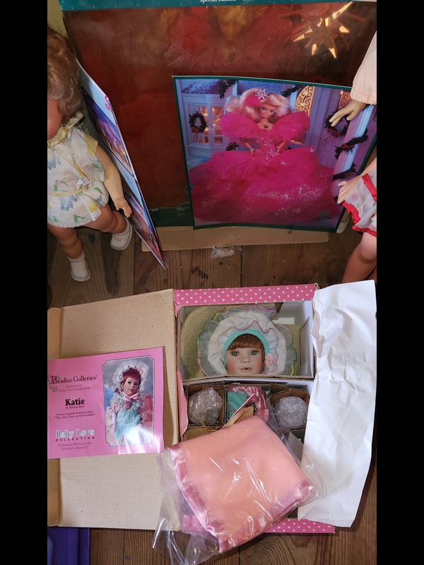 Dolls. Over 100 dolls, some antique, some vintage, some porcelain, incl: Barbies, Kens, & GI Joes type, including Happy Holidays Barbie, in box; Paradise Galleries "Katie" porcelain, new in box; framed pane of 15 dolls 32c US stamps. See photos for details. Located on the second floor.