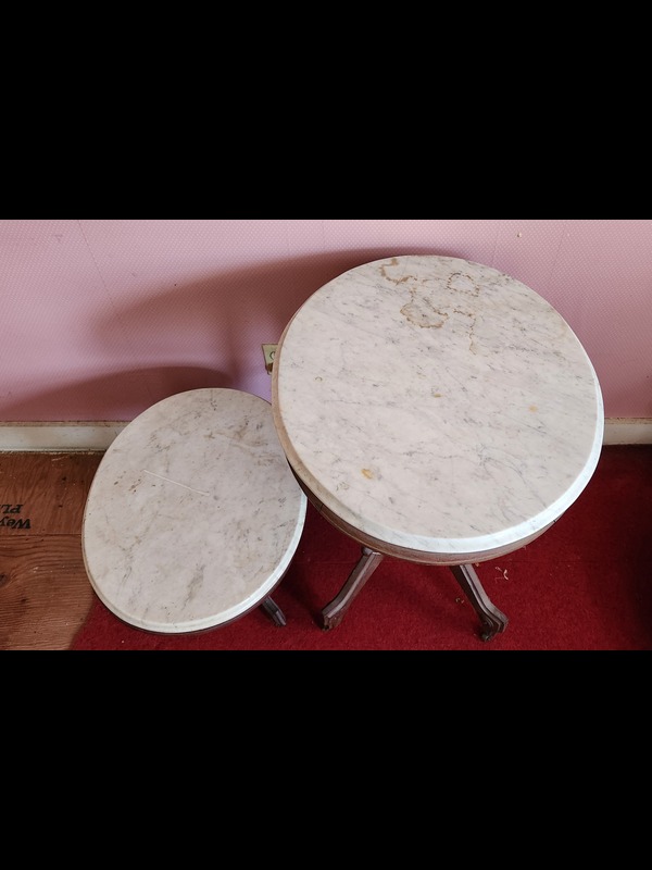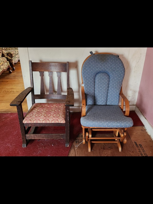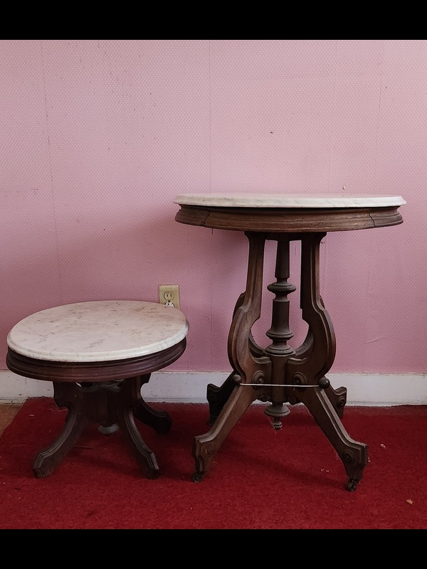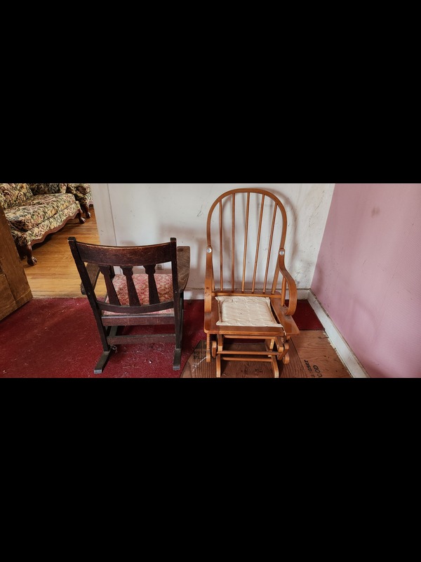 Two Rockers and Two Marble-top Tables. Antique/vintage rocker, 25.5"Wx27.5"Dx3'H; modern glider with removable seat & back cushions, 23"Wx26"Dx40"H; two antique/vintage oval marble-top tables: larger on casters, 29"x23.5"x29.5"H (legs braced for stability), smaller 25"x18.5"x16"H (both have paint/stains on marble surface).