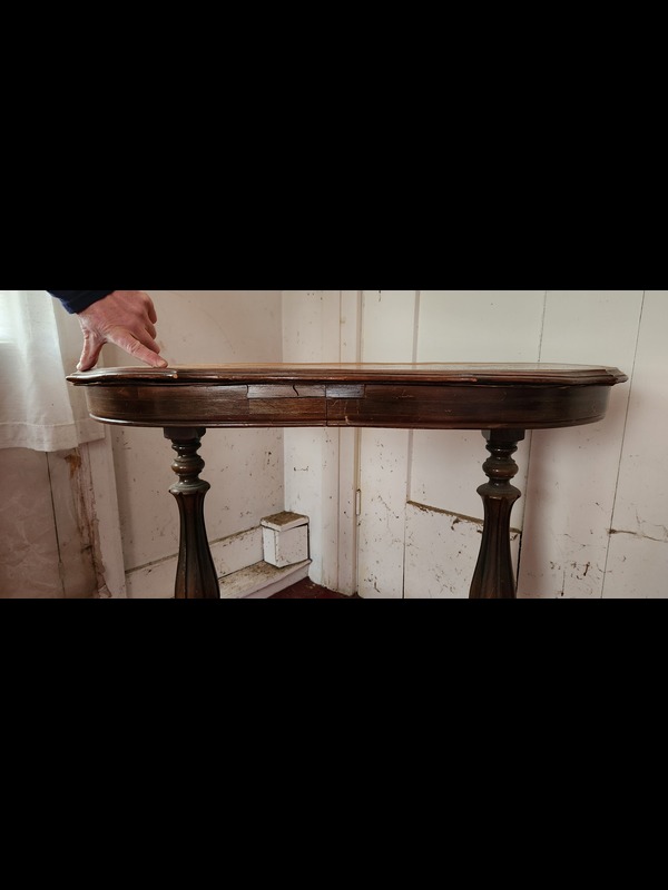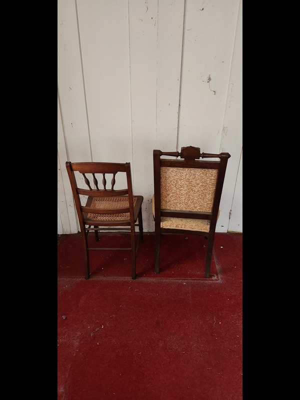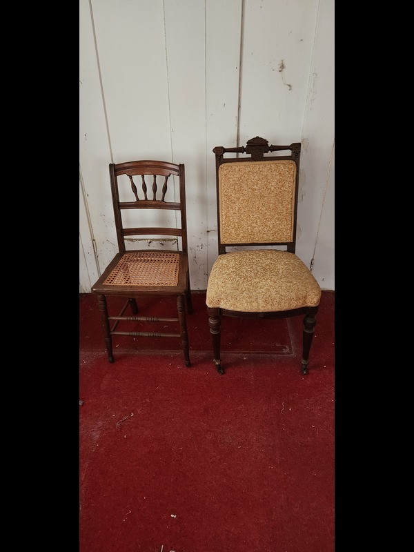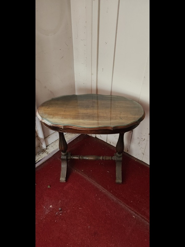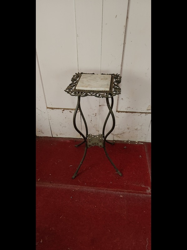 Antique Oval Table, Two Chairs, and Plant Stand. Antique dual-pedestal scallop-edge oval table with custom glass top, 2'x22"x31"H (laminate peeling; top surface crack); antique caned seat chair, 16.5"Wx15.5"Dx34"H; antique upholstered seat & back carved wood chair, on casters, 19"Wx18"Dx38"H; metal plant stand with marble insert top, 12.5"sq x29.5"H.