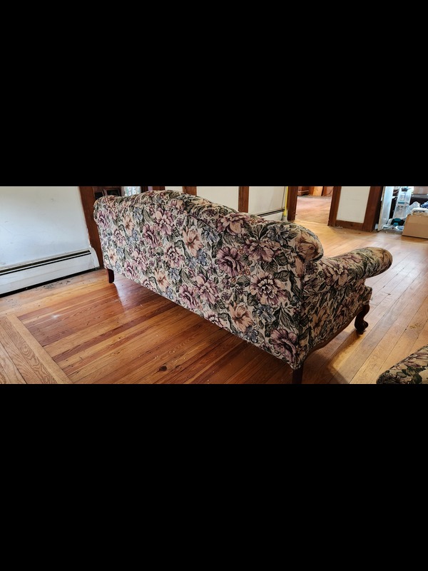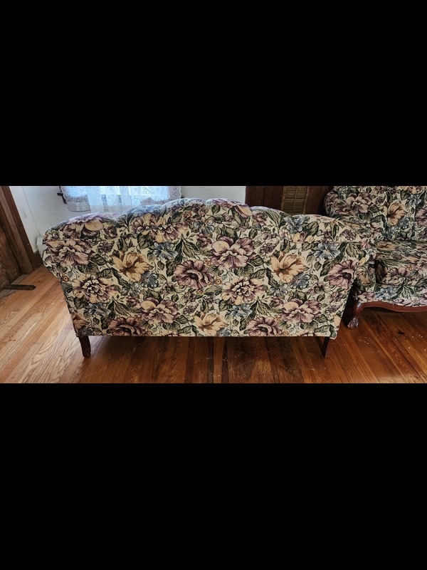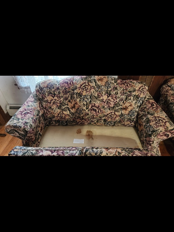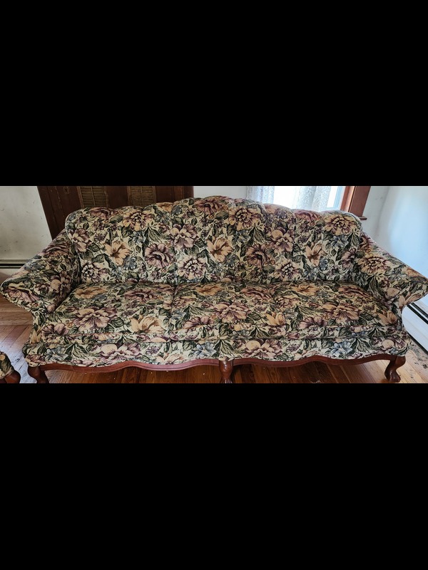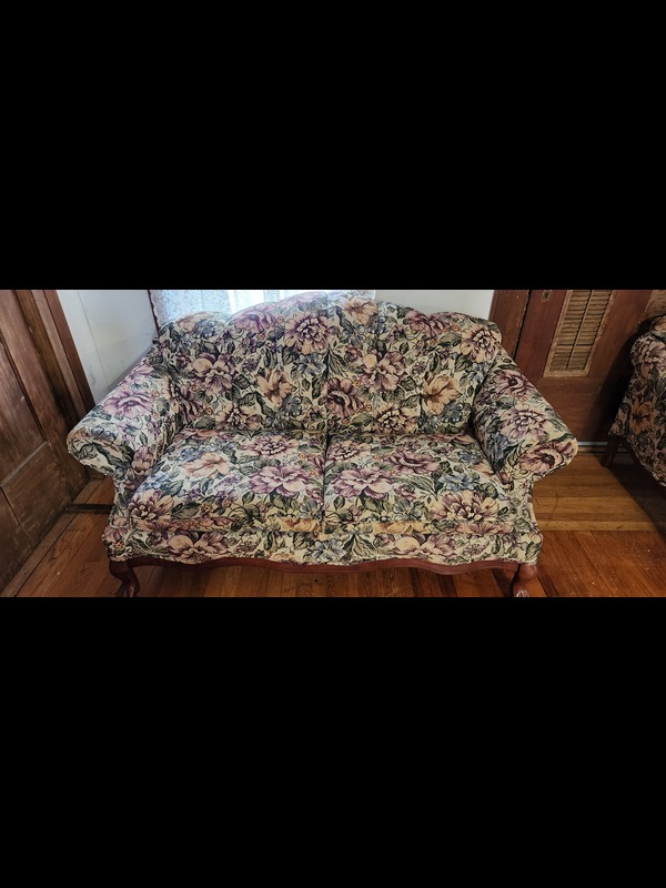 Sofas and Love Seat Set. Camel-back sofa & love seat set with removable seat cushions: sofa 93"Wx34"Dx35"H, love seat 66"Wx (same). Both stained under cushions.