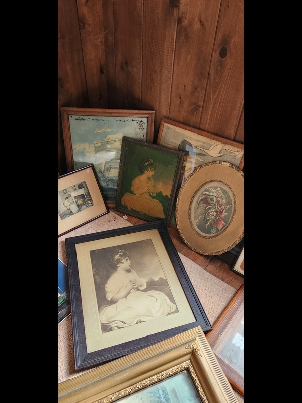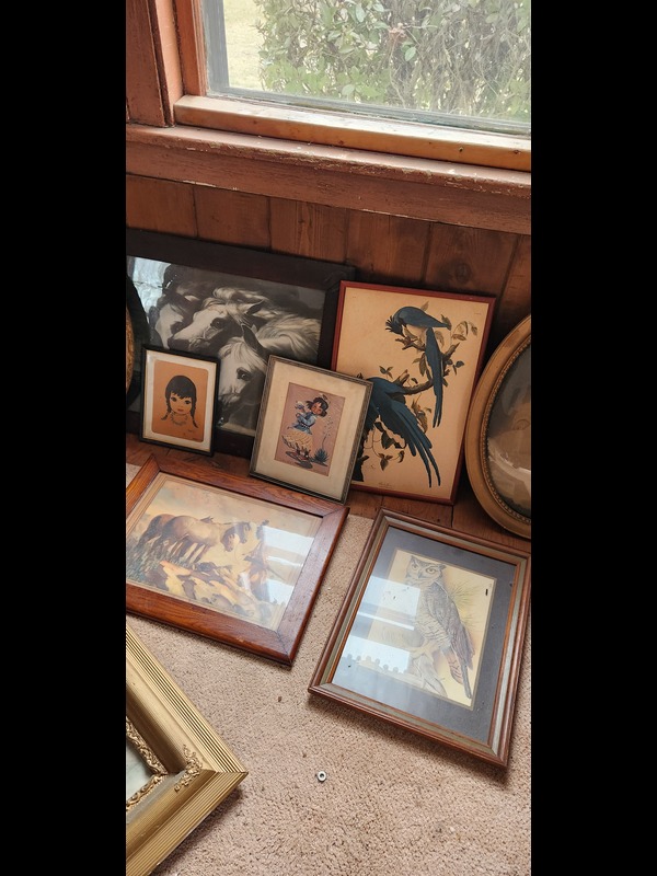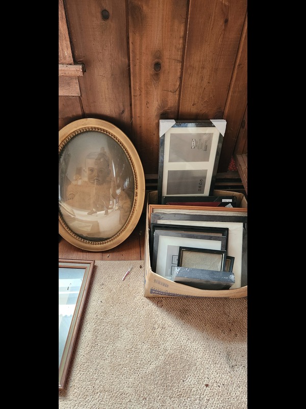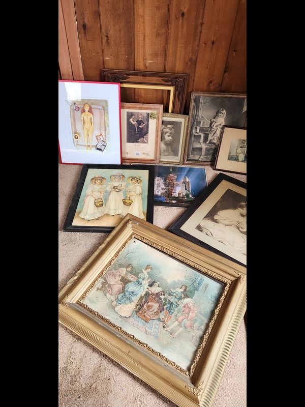 Antique, Vintage, and Modern Frames. 21 frames + box of 15 modern frames (some have prints, photos, etc.) incl: gilt wood 28"x2', 4.5"W; carved wood 19.5"x22.5", 4"W; gilt painted wood oval (damaged trim), 19.5"x15", 3.5"W; horse motif (horseshoes in corners), 24.5"x20.5"; oval with fisheye glass, 16.5"x23". See photos for details.