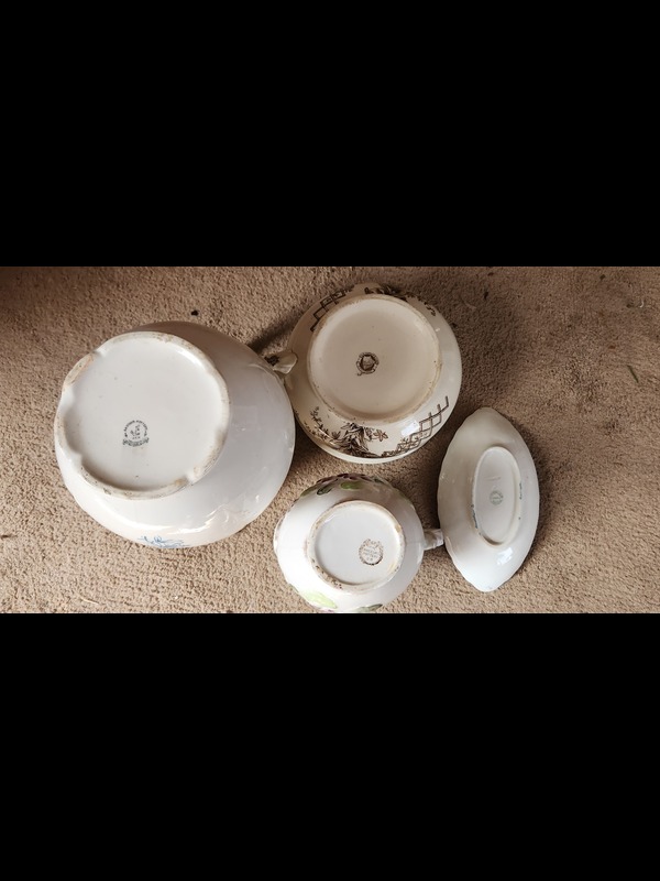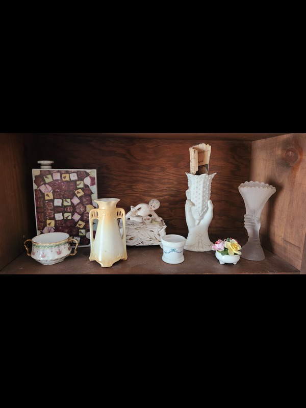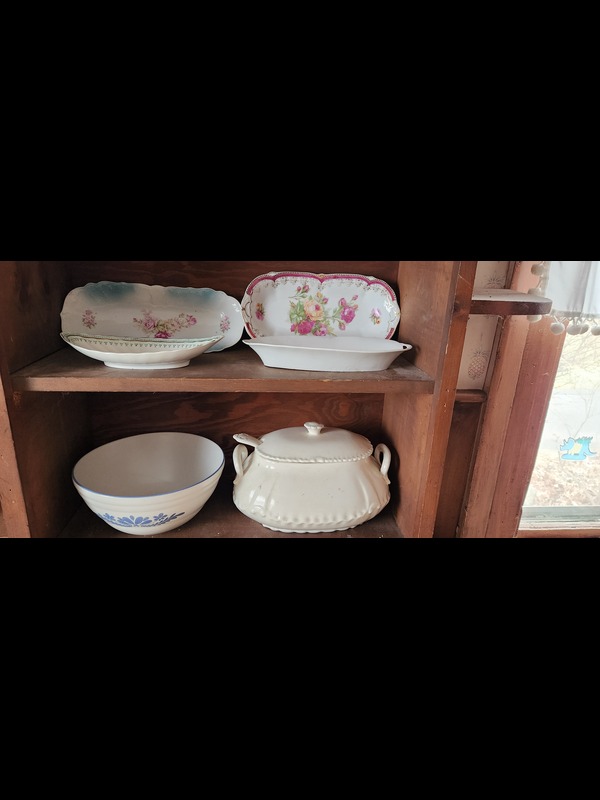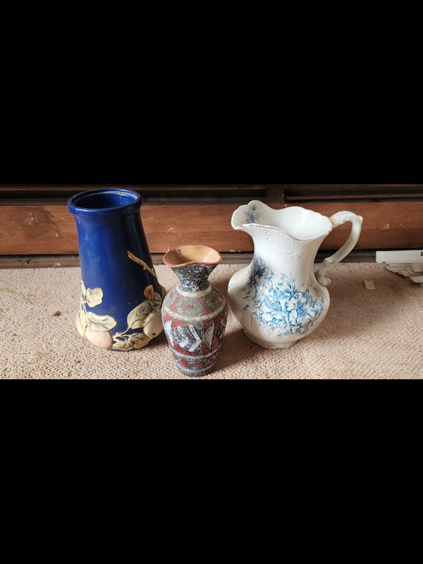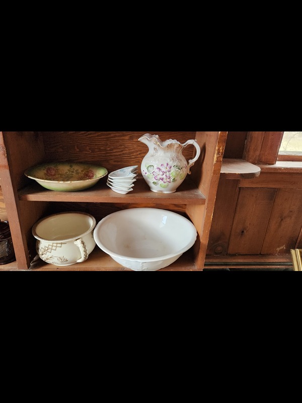 Pottery. 25 pieces including Parian Ware hand vase 8"H (with newspaper article provided); four oblong trays; Pfaltzgraff bowl, 10"diam; tureen with cover & ladle, 11"W (no apparent flaws); Wheeling Pottery pitcher, 9"Wx7.5"H; set of four Waterloo crescent plates; Turner & Sons "Beatrice" Tunstall handled bowl, 9"diam; Semivitreous basin 15"diam & Anchor Pottery Pitcher 11"H (both need cleaning; no apparent flaws); earthenware vase 13"H; hand-painted Italian vase 10.5"H. See photos for manufacturer marks and other pcs.