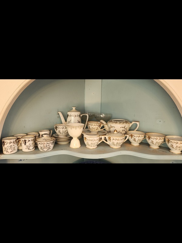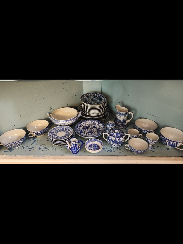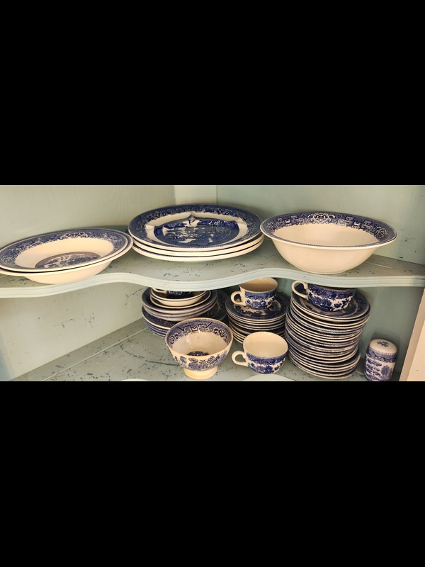 Blueware and Anniversary China. 56 piece set Willow Ware (assort pieces, several with chips & cracks); 38 pieces miscellaneous blueware from China & Japan incl covered tureen 1'W; 15 pieces 25th anniversary China (including two stemware); 12 pieces 50th anniversary China (same pattern).
