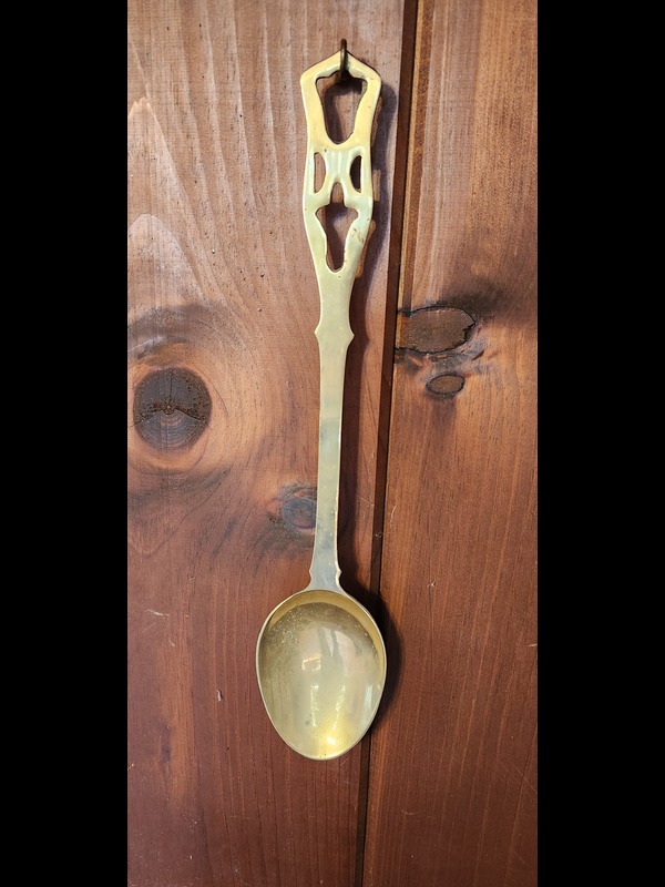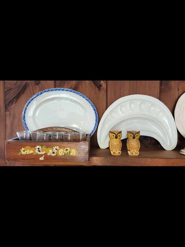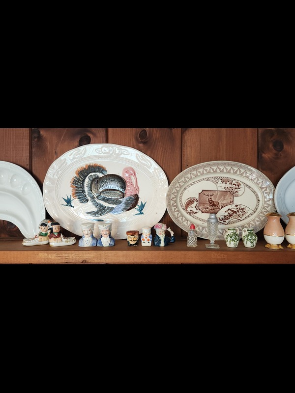 Large Platters and Salt and Pepper Shakers. Platters: English blueware, crescent egg platter, turkey platter 18"x14", stag platter, white oval platter; brass spoon 16"L; two wood handled carry trays; set of six cordial stemware; five pair & five individual S&P shakers, tallest 4.25"H.