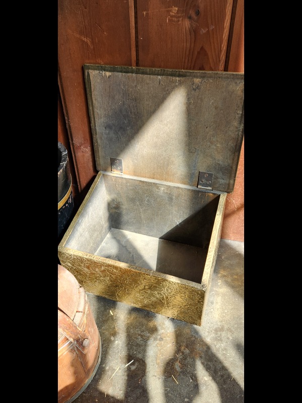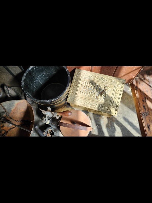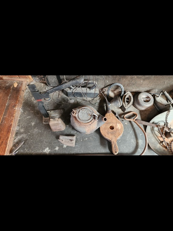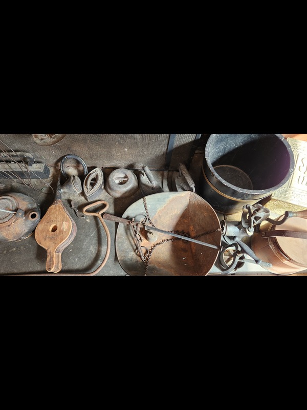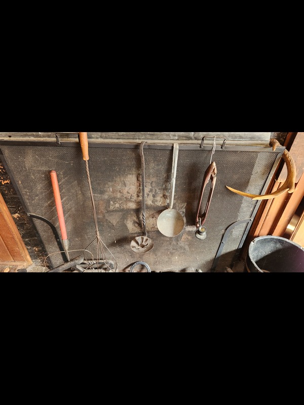 Fireplace Utensils and Antique Metal Goods. Fireplace screen; pair of owl andirons; two rug beaters; bottle corker; scale; two wooden buckets; metal slipper warmer box; five flatirons; bellows; grinder; other related items as in photos.