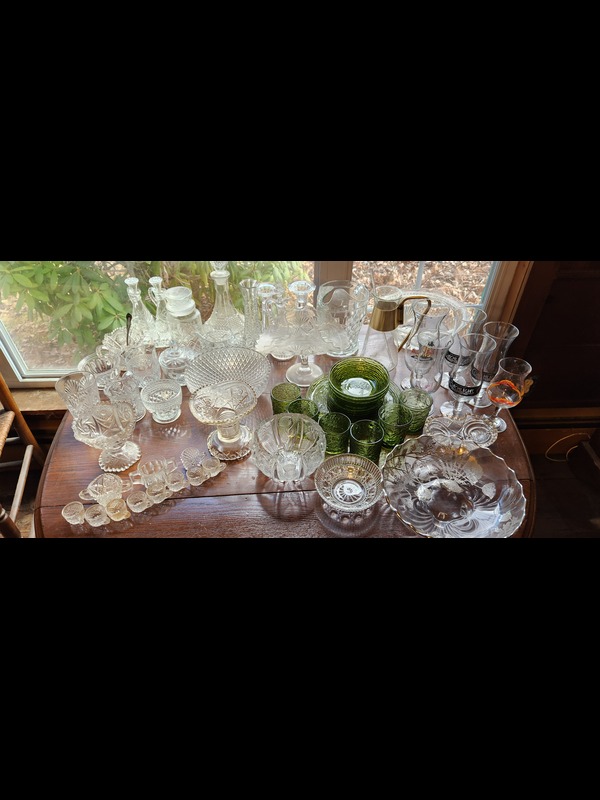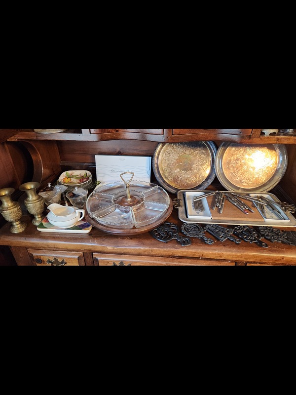 Glass, Pewter, and Silverplate Entertaining and Trivets. Beaded clear glass tipped pitcher set with five tumblers & six glasses; 13 piece green glass set; approx. 45 clear glass pieces; six-glass-tray condiment lazy susan; two silverplate platters 12.5"diam; pair brass vase-shaped candle holders; 15 pieces pewter, largest is pitcher 9"H; sterling 507 candle holder 4.5"diam x2.5"H; nutcrackers & picks; Grove stoneware tray, new in box; seven trivets; other related items as in photos. Hutch and table not included.