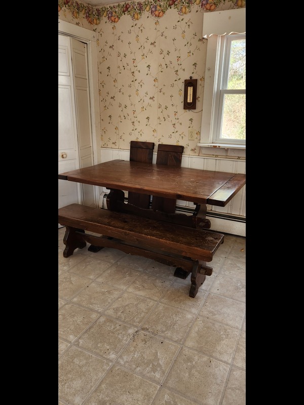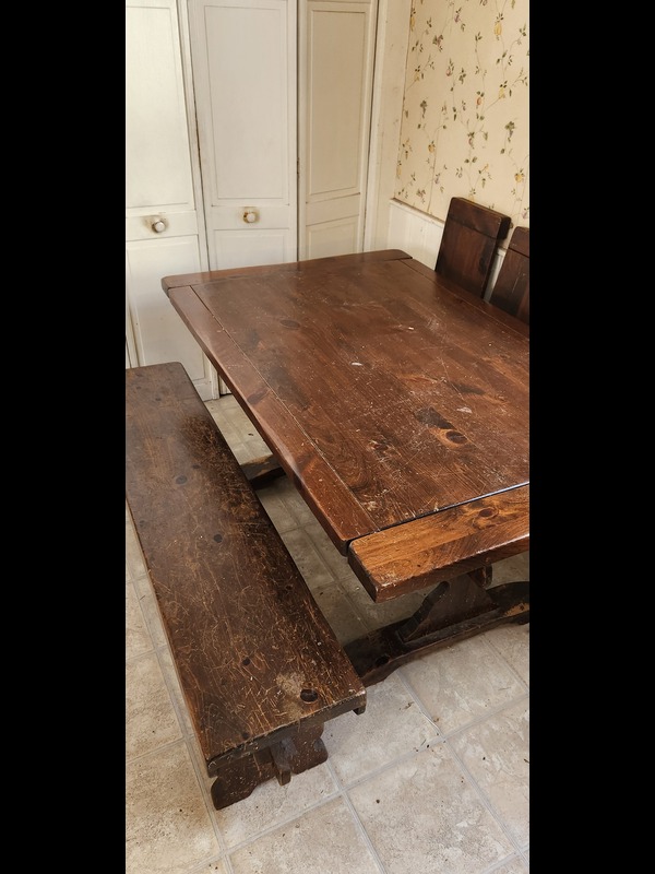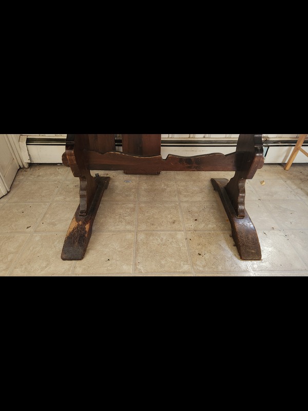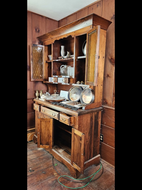Pine China Cabinet and Trestle Table. Pine two-piece China cab with five dovetailed drawers, four-door lower cab with single shelf; two upper cabs ea. with single shelf, plate grooves & spoon slots, bottom 49"Wx19"Dx34"H, top 53"Wx14.5"Dx44"H (heavy wear); pine dual-pedestal table with single bench seat, 62" + two 1' leafs x38"x30"H (heavy wear, especially the bench). Contents of China cab not included