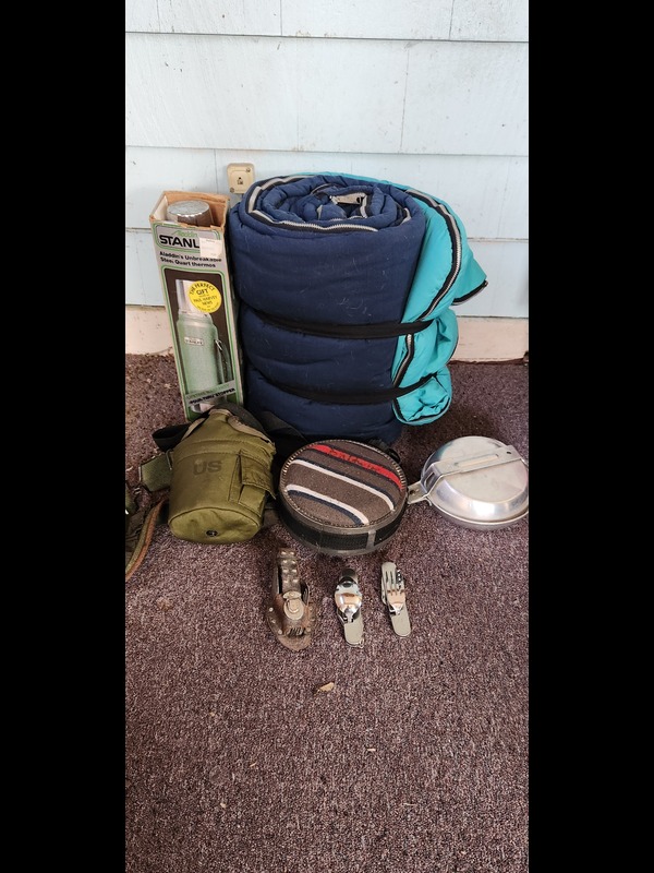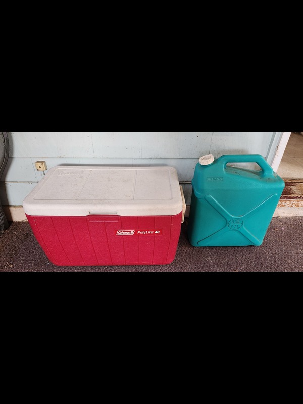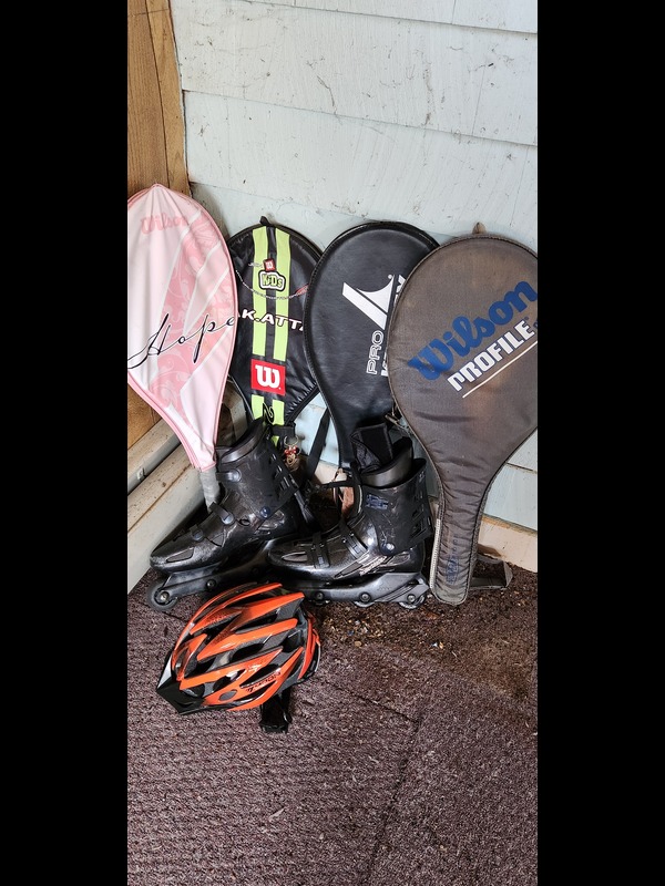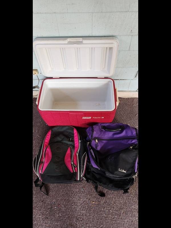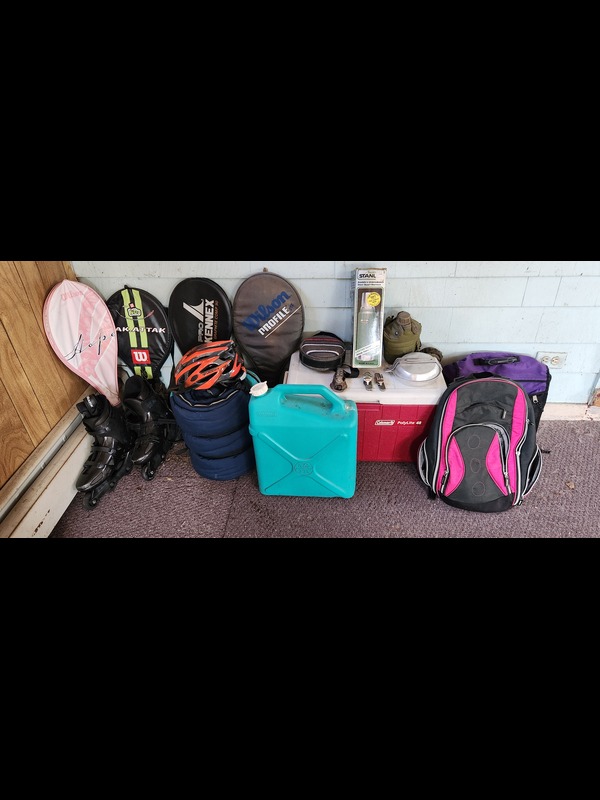 Outdoor Activities Gear. Coleman PolyLite 48 cooler (fairly clean); Reliance six gallon water tote; sleeping bag; two backpacks: LL Bean & Ikea; bike helmet; four tennis rackets with covers; pair of Razor Bravablade roller blades; Stanley thermos, in box; two canteens; mess kit; three folding flatware sets.