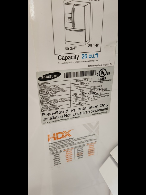 Samsung Stainless Steel Refrigerator. Samsung refrigerator with water & ice dispenser RF267AERS, 3'Wx30.5"Dx70"H (req cleaning).