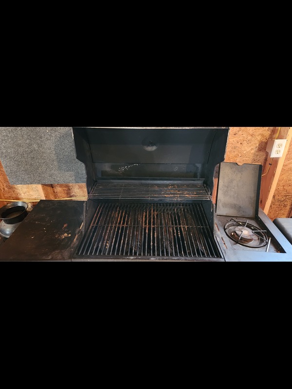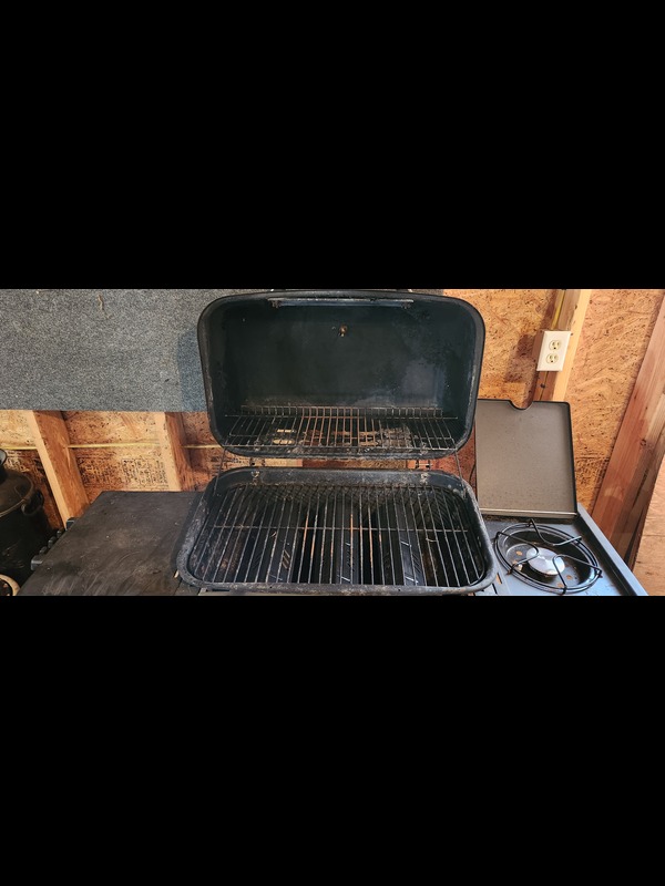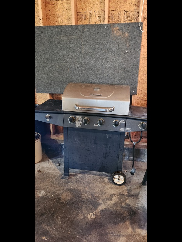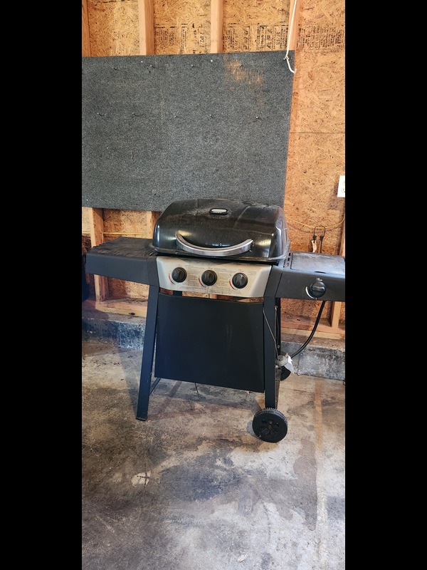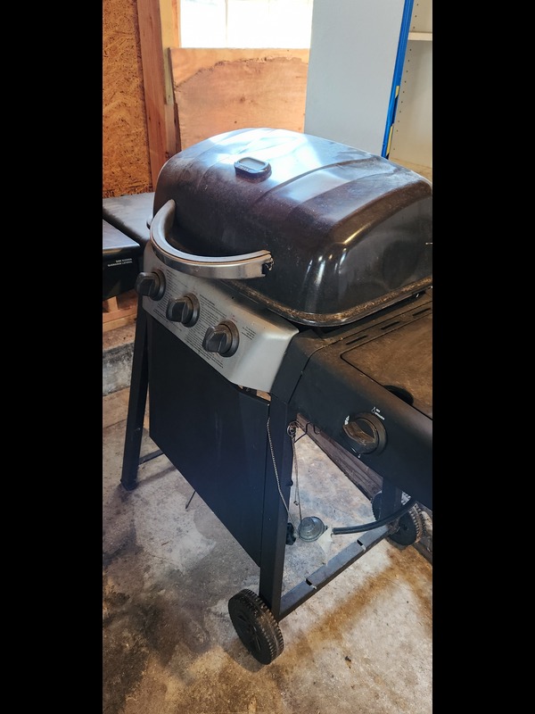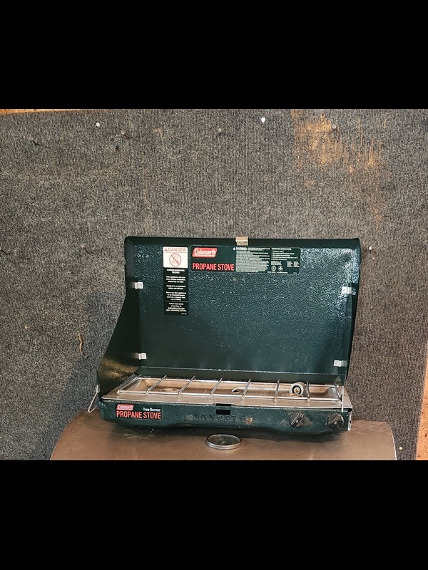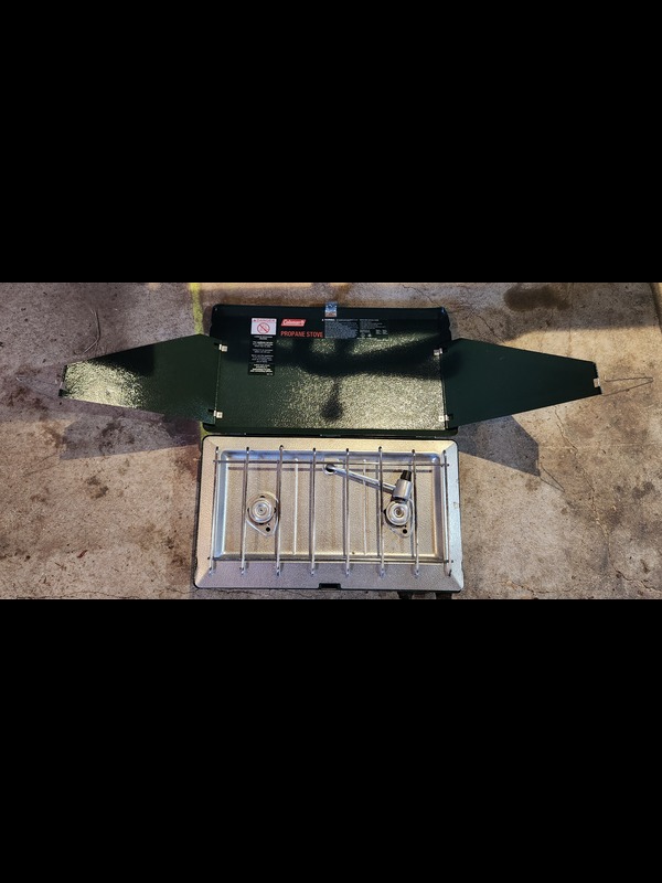 Grills. Brinkman 4 + side burner grill; Backyard ™ 3 + side burner grill (dented cover); Coleman two-burner folding portable propane stove. Located in the garage.