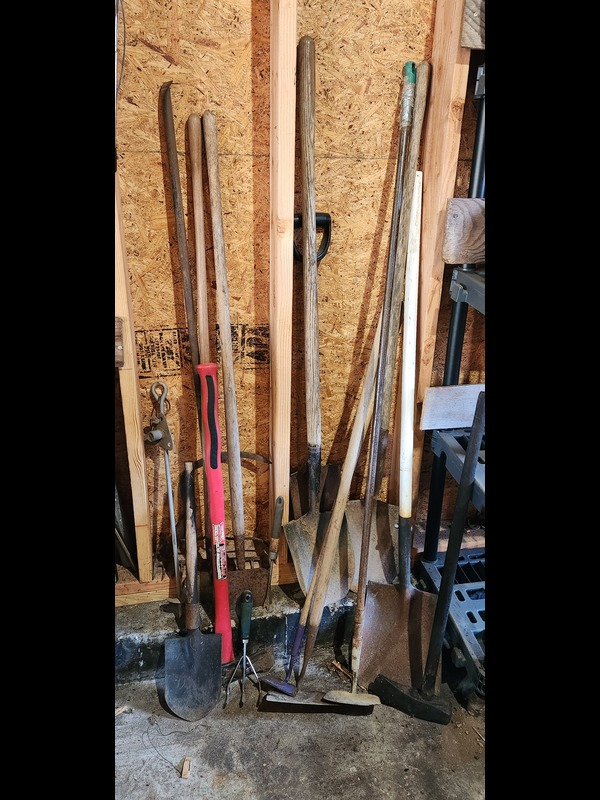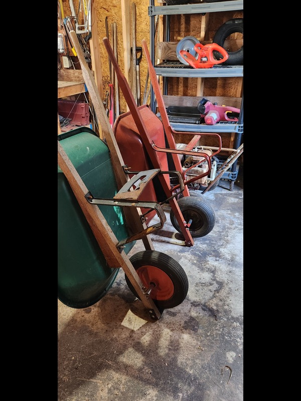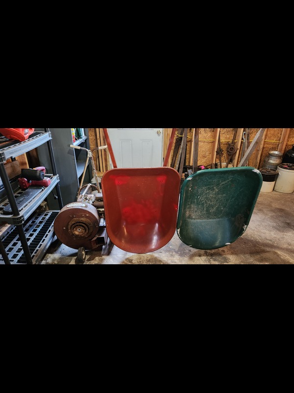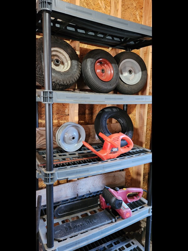 Yard and Garden Tools. Steel wheelbarrow; plastic wheelbarrow; Air Rake yard blower (rusty but working last autumn per client); Chicago Electric 14" chain saw; B&D 17" hedge trimmer TR1700; three wheelbarrow tire and three rims; tractor tire 15x6.00 on 7" rim; assorted long-handle tools; five-shelf plastic rack, 3'Wx18"Dx78"H. See photos for details. Located in the garage.