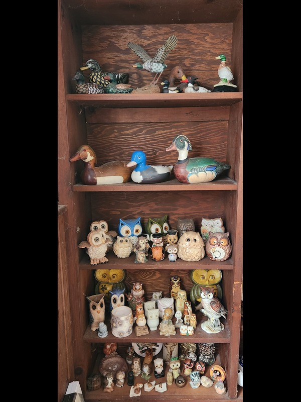 Decoys and Owl Décor. Three large & eight small duck decoy/statuary incl Weiss porcelain duck 1'W & Hummel Waterloo wooden duck 14"W; 60 owl décor pieces including four piece Matryoshka nesting wood owls. See photos for details.