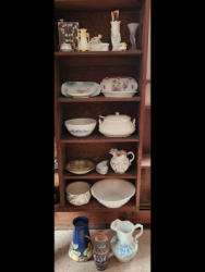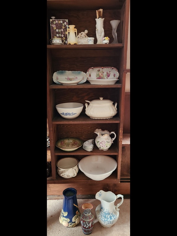Pottery. 25 pieces including Parian Ware hand vase 8"H (with newspaper article provided); four oblong trays; Pfaltzgraff bowl, 10"diam; tureen with cover & ladle, 11"W (no apparent flaws); Wheeling Pottery pitcher, 9"Wx7.5"H; set of four Waterloo crescent plates; Turner & Sons "Beatrice" Tunstall handled bowl, 9"diam; Semivitreous basin 15"diam & Anchor Pottery Pitcher 11"H (both need cleaning; no apparent flaws); earthenware vase 13"H; hand-painted Italian vase 10.5"H. See photos for manufacturer marks and other pcs.