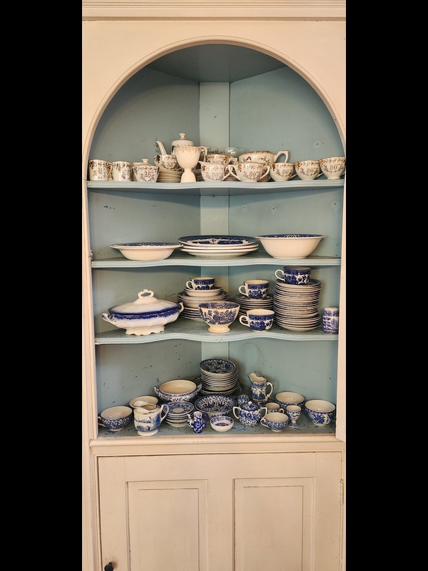 Blueware and Anniversary China. 56 piece set Willow Ware (assort pieces, several with chips & cracks); 38 pieces miscellaneous blueware from China & Japan incl covered tureen 1'W; 15 pieces 25th anniversary China (including two stemware); 12 pieces 50th anniversary China (same pattern).