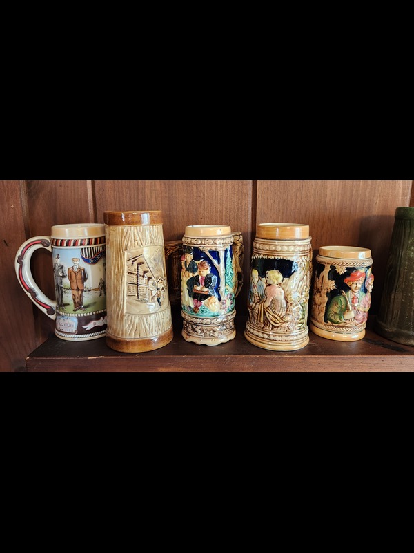 Steins. 14 steins incl four German style, two metal, one metal with cover, one glass with cover, tallest 8"H. See photos for details.