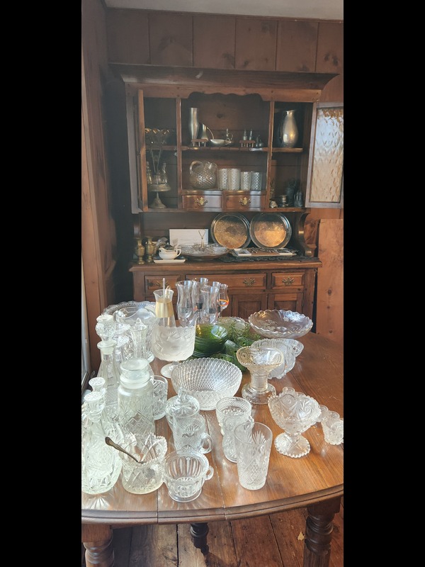Glass, Pewter, and Silverplate Entertaining and Trivets. Beaded clear glass tipped pitcher set with five tumblers & six glasses; 13 piece green glass set; approx. 45 clear glass pieces; six-glass-tray condiment lazy susan; two silverplate platters 12.5"diam; pair brass vase-shaped candle holders; 15 pieces pewter, largest is pitcher 9"H; sterling 507 candle holder 4.5"diam x2.5"H; nutcrackers & picks; Grove stoneware tray, new in box; seven trivets; other related items as in photos. Hutch and table not included.