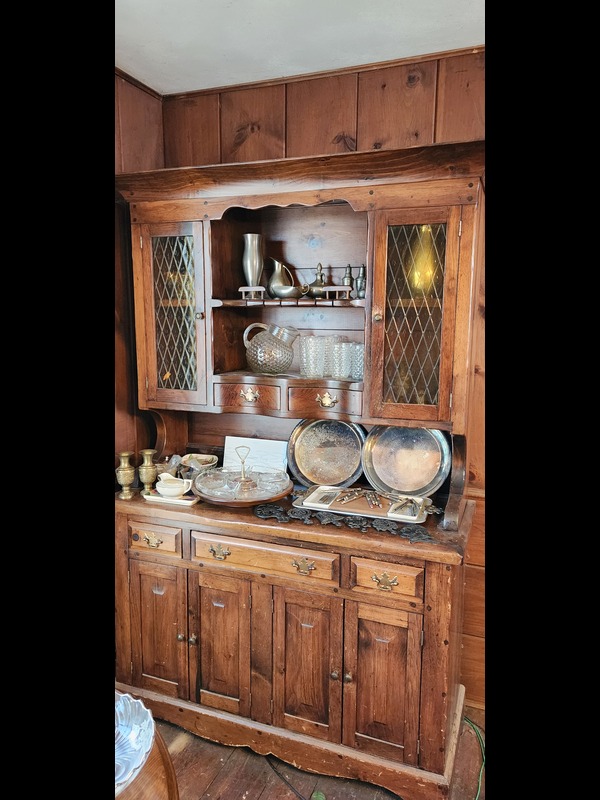 Pine China Cabinet and Trestle Table. Pine two-piece China cab with five dovetailed drawers, four-door lower cab with single shelf; two upper cabs ea. with single shelf, plate grooves & spoon slots, bottom 49"Wx19"Dx34"H, top 53"Wx14.5"Dx44"H (heavy wear); pine dual-pedestal table with single bench seat, 62" + two 1' leafs x38"x30"H (heavy wear, especially the bench). Contents of China cab not included