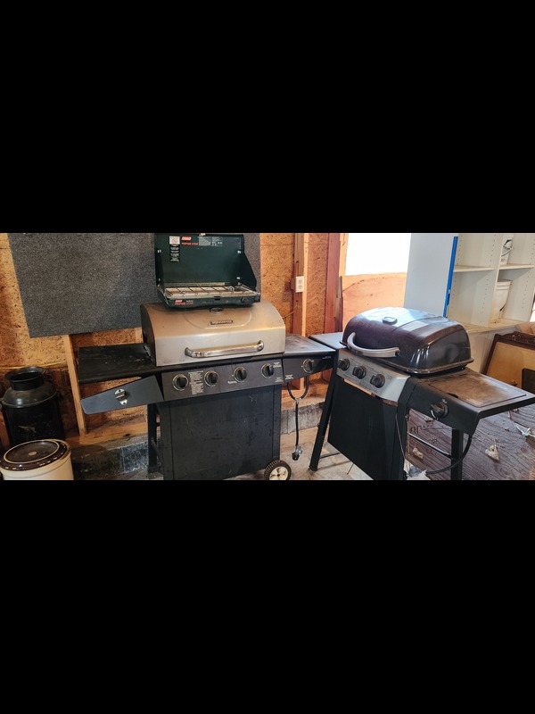 Grills. Brinkman 4 + side burner grill; Backyard ™ 3 + side burner grill (dented cover); Coleman two-burner folding portable propane stove. Located in the garage.