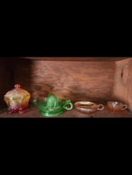 Depression Glass, Plates, Teacups, and Teapots. Four pieces depression glass including candy dish & juicer; four plates, largest 10"diam; two-piece service of six Merit occupied Japan square teacup/saucer set; seven teacup/saucer sets by Colclough, Royal Sealy, Merit (occupied Japan), Staffordshire, three others; four teapots, all approx. 9.5"W; other related items as in photos.