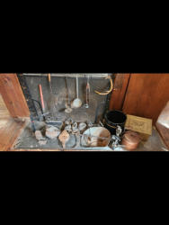 Fireplace Utensils and Antique Metal Goods. Fireplace screen; pair of owl andirons; two rug beaters; bottle corker; scale; two wooden buckets; metal slipper warmer box; five flatirons; bellows; grinder; other related items as in photos.