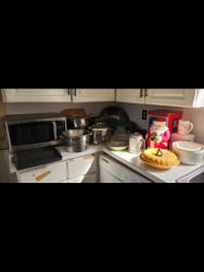 Kitchen Cookware, Microwave, and Serving ware. Toshiba 900 Watt microwave EM925A5ASS (needs cleaning); set covered pots; metal mixing bowl 16"diam; metal mixing bowl with cover; one Pyrex & two Corelle mixing bowls; Rachel Ray skill & German made fry pan; covered pumpkin pie plate; Santa cookie jar, in box, 13"H (shows wear); "The Butcher's Daughter" Arundel pig mug, in box; pizza board; other related items as in photos.