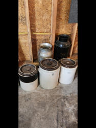 Crocks and Milk Jugs. Three earthenware crocks: "8" with cover, crown 6 with cover (broken knob), & crown 5 with cover; galvanized milk jug 14"H; black painted milk jug 19"H. Located in the garage.