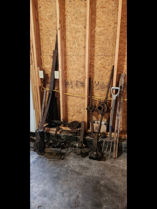 Vintage Heavy Metal Tools. Vintage metal tools and components incl: two twin-handled saws (only one wooden handle); cast iron bird bath base (no bowl); two heavy duty tap & die handles; two trailer hitches; hand auger; jack; barn hinge 51"L; pick axe; 4' level; other related items as in photos. Located in the garage.