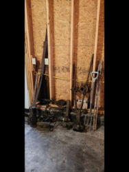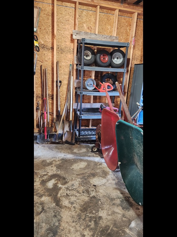 Yard and Garden Tools. Steel wheelbarrow; plastic wheelbarrow; Air Rake yard blower (rusty but working last autumn per client); Chicago Electric 14" chain saw; B&D 17" hedge trimmer TR1700; three wheelbarrow tire and three rims; tractor tire 15x6.00 on 7" rim; assorted long-handle tools; five-shelf plastic rack, 3'Wx18"Dx78"H. See photos for details. Located in the garage.