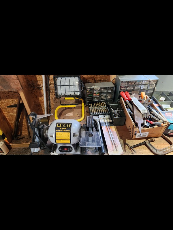 Bench Tools. Black Bull 6" bench grinder (needs removal); halogen cage light; heavy duty drill bit set, & other assorted bits; four parts cabinets; B&D jig saw 7564 type 5; B&D 3/8" drill 7104 type 2; Chicago Electric electric chain saw sharpener 68221; bench vice (needs removal). Located in the garage.
