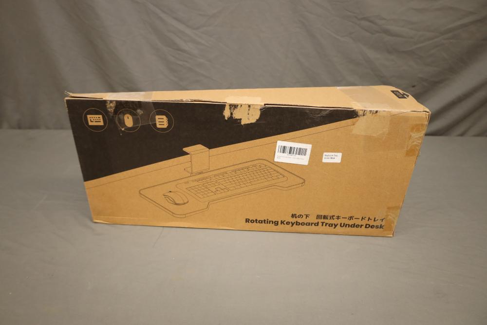 Walnut pattern rotating keyboard tray under desk. Appearing to be new in original box.