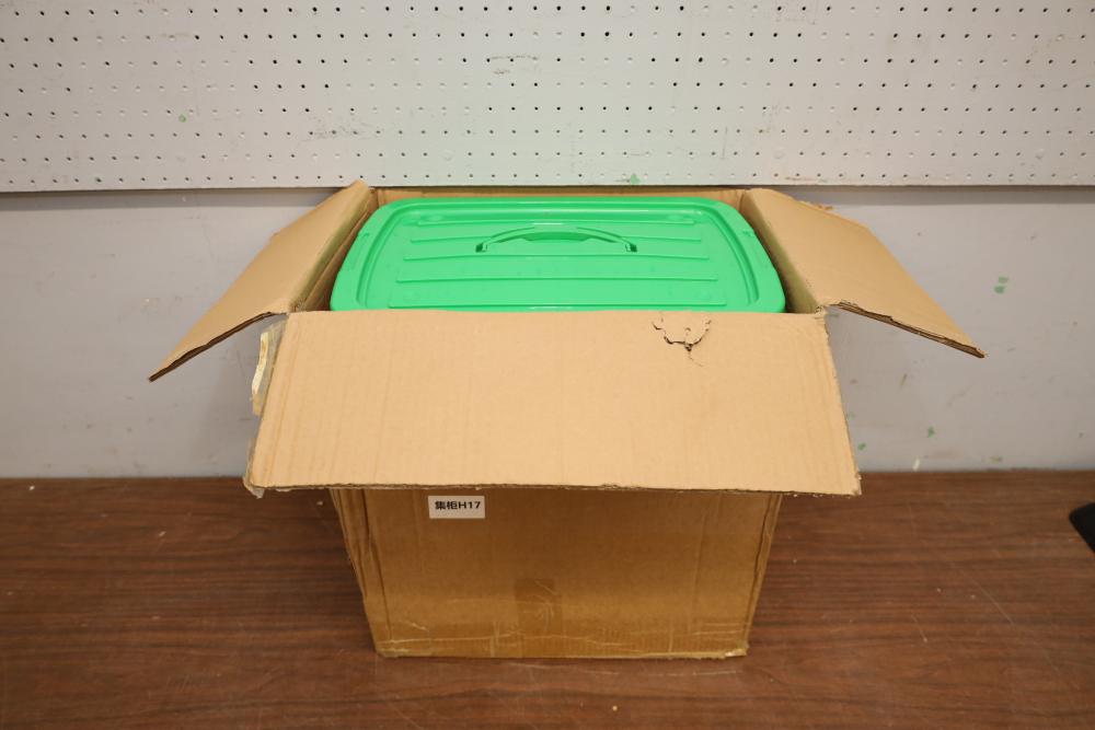 Six plastic storage bins three green and three red all with lids. One bin with damage.
