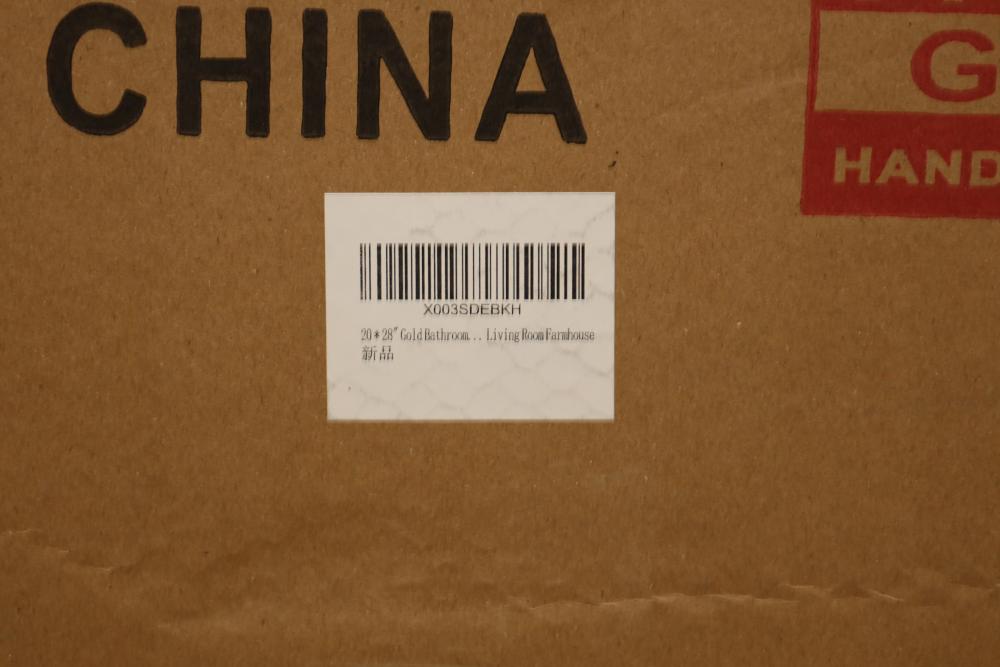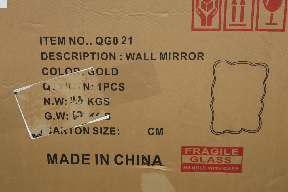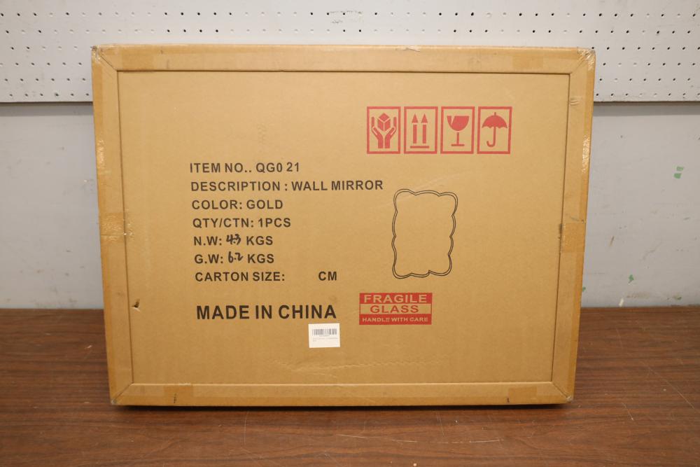 20" X 28" gold colored hanging bathroom mirror. Appearing to be new in original box.