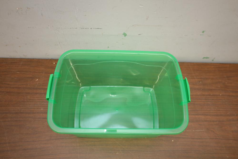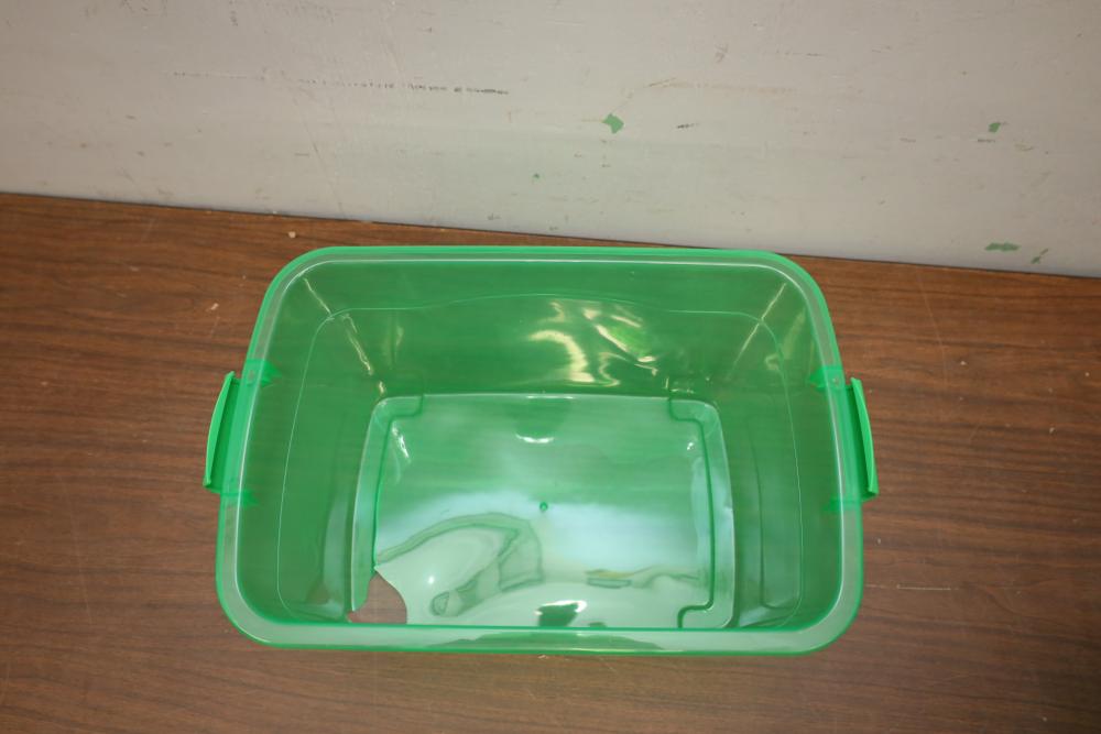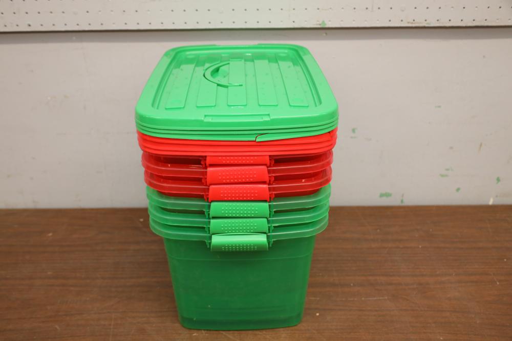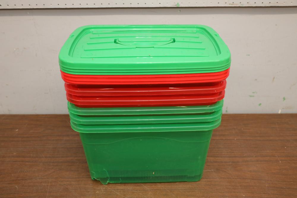 Six plastic storage bins three green and three red all with lids. One bin with damage.